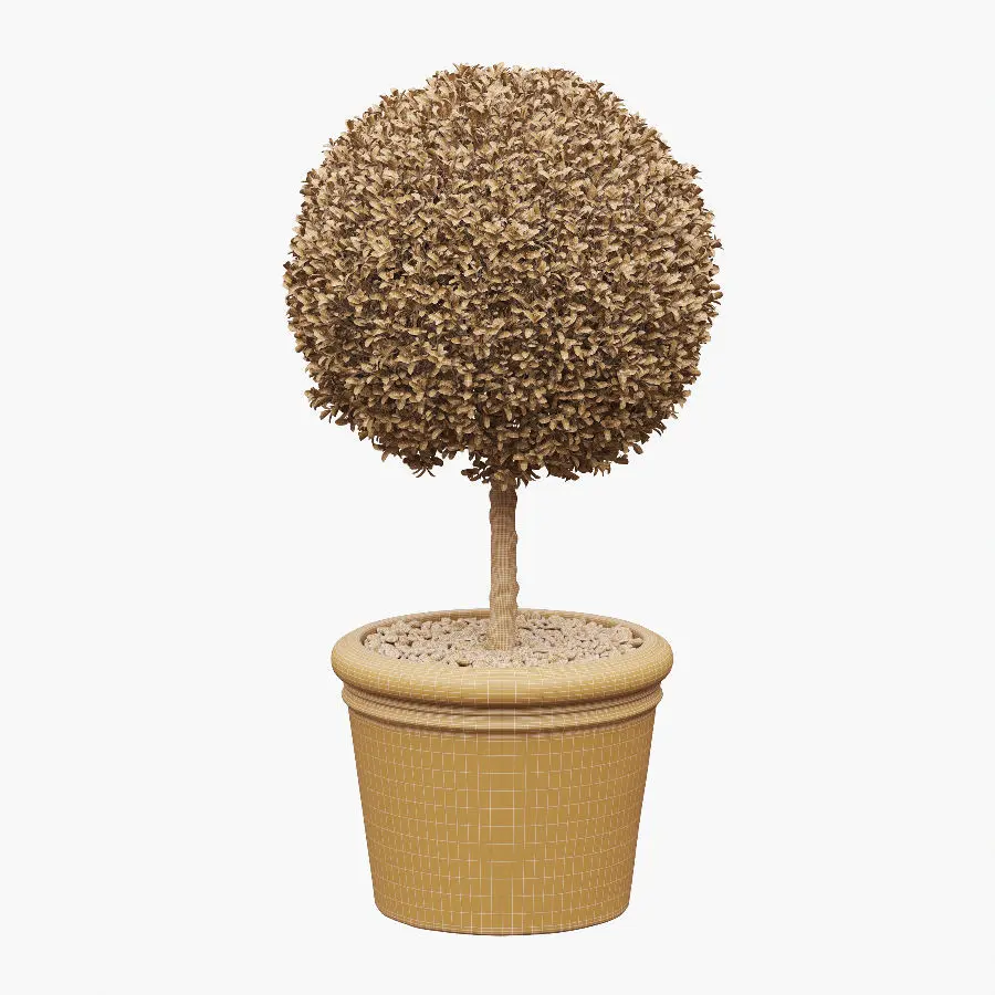 Potted topiary sphere-shaped buxus (boxwood, european box, common box, buxus sempervirens, american boxwood, common boxwood) bush in ceramic pot with pebbles covering.Buxus is evergreen and very hardy and can be shaped into any form. For gardeners who enjoy ordered and very neat growth without having to do too much maintenance, this plant has become a favourite for containers, low hedges and other topiary.Pot made from white textured ceramics with pebble covering around the trunks.