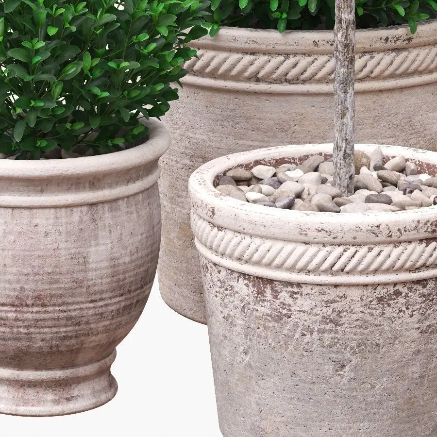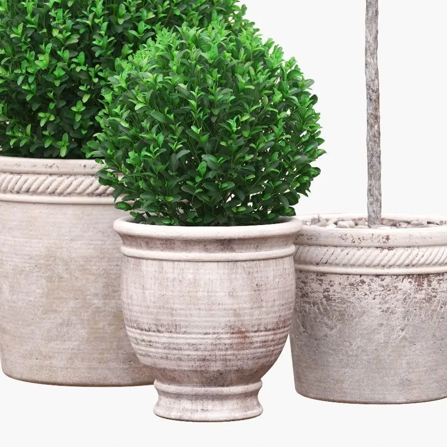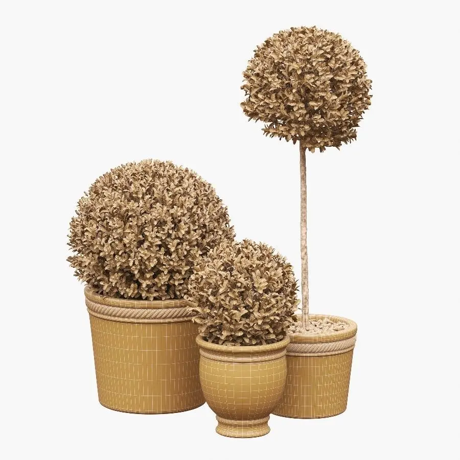 All models have unique names. Subdivision Ready. Clean topology based on quads.Three potted topiary sphere-shaped buxus (boxwood, european box, common box, buxus sempervirens, american boxwood, common boxwood) bushes in ceramic pots with pebbles covering, one shrub on stem.Buxus is evergreen and very hardy and can be shaped into any form. For gardeners who enjoy ordered and very neat growth without having to do too much maintenance, this plant has become a favourite for containers, low hedges and other topiary.Pot made from white textured ceramics with pebble covering around the trunks.