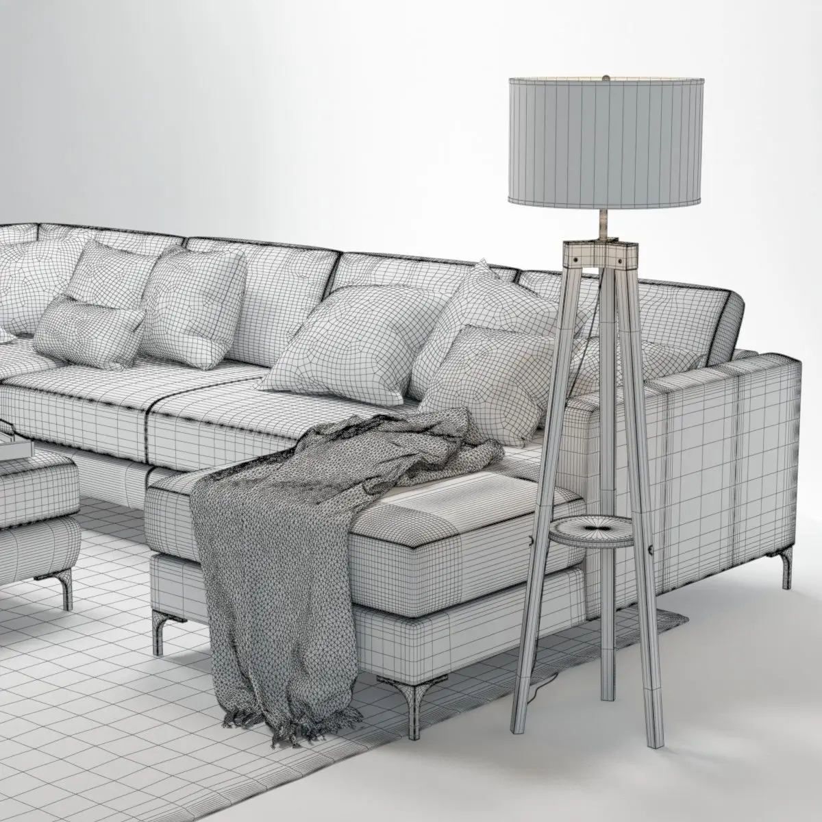 High-detailed 3D set of Pottery Barn Jake sectional sofa with Milos tripod floor lamp, ottoman and decorThe sofa is in 2 colours
