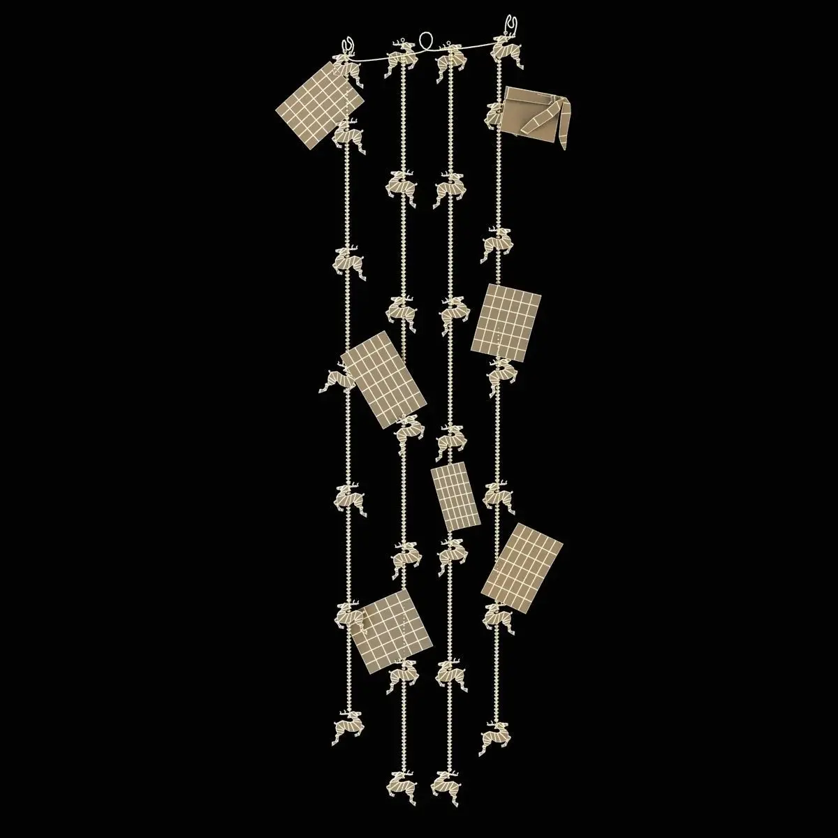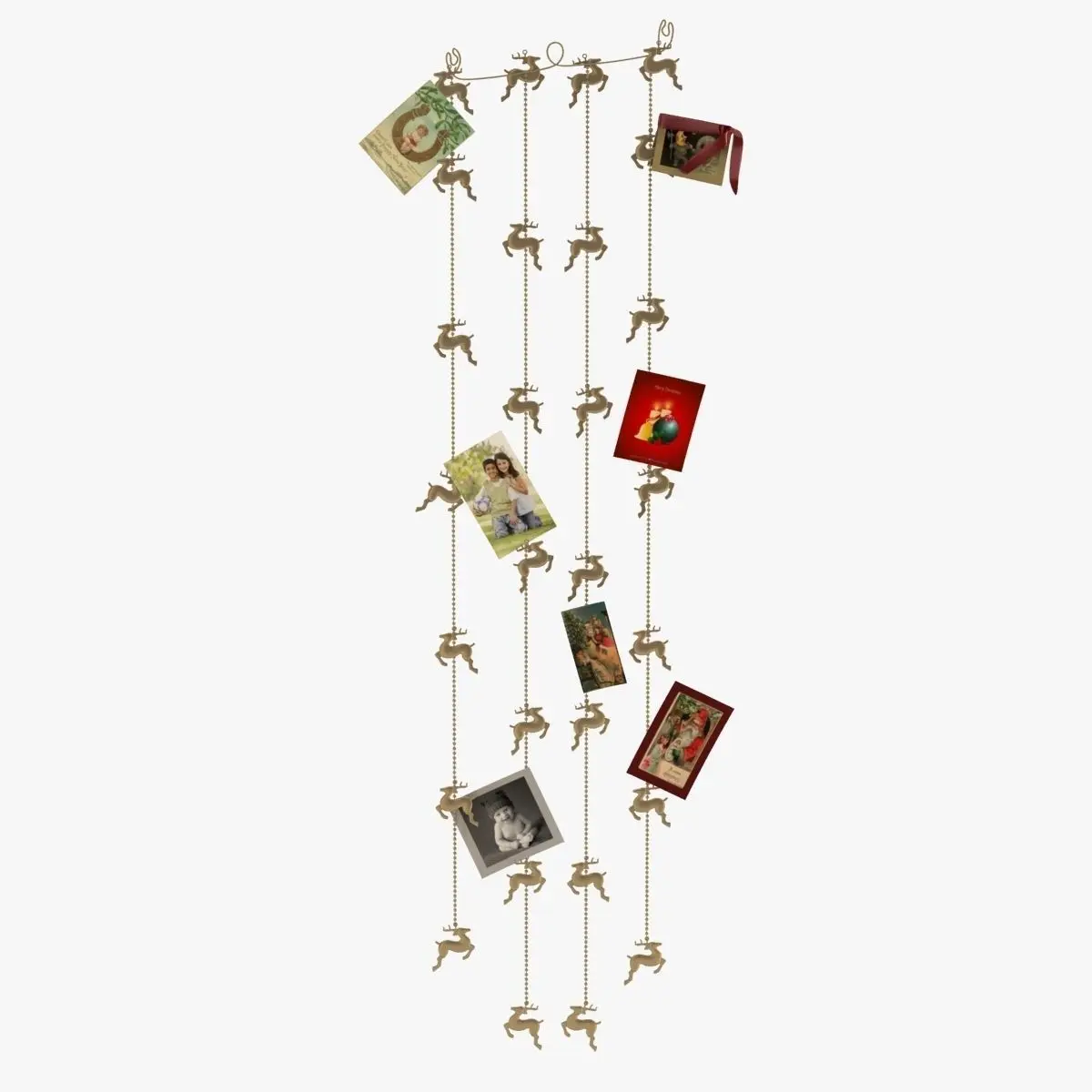 This fleet of reindeer can display holiday cards or photos, giving a collection of cherished sentiments a place to shine.8' wide x 3' deep x 58' highMade of steel with a brass finish.Four chains suspend from an over-the-door hanger.Each chain has seven reindeer clips that hold cards or photos.