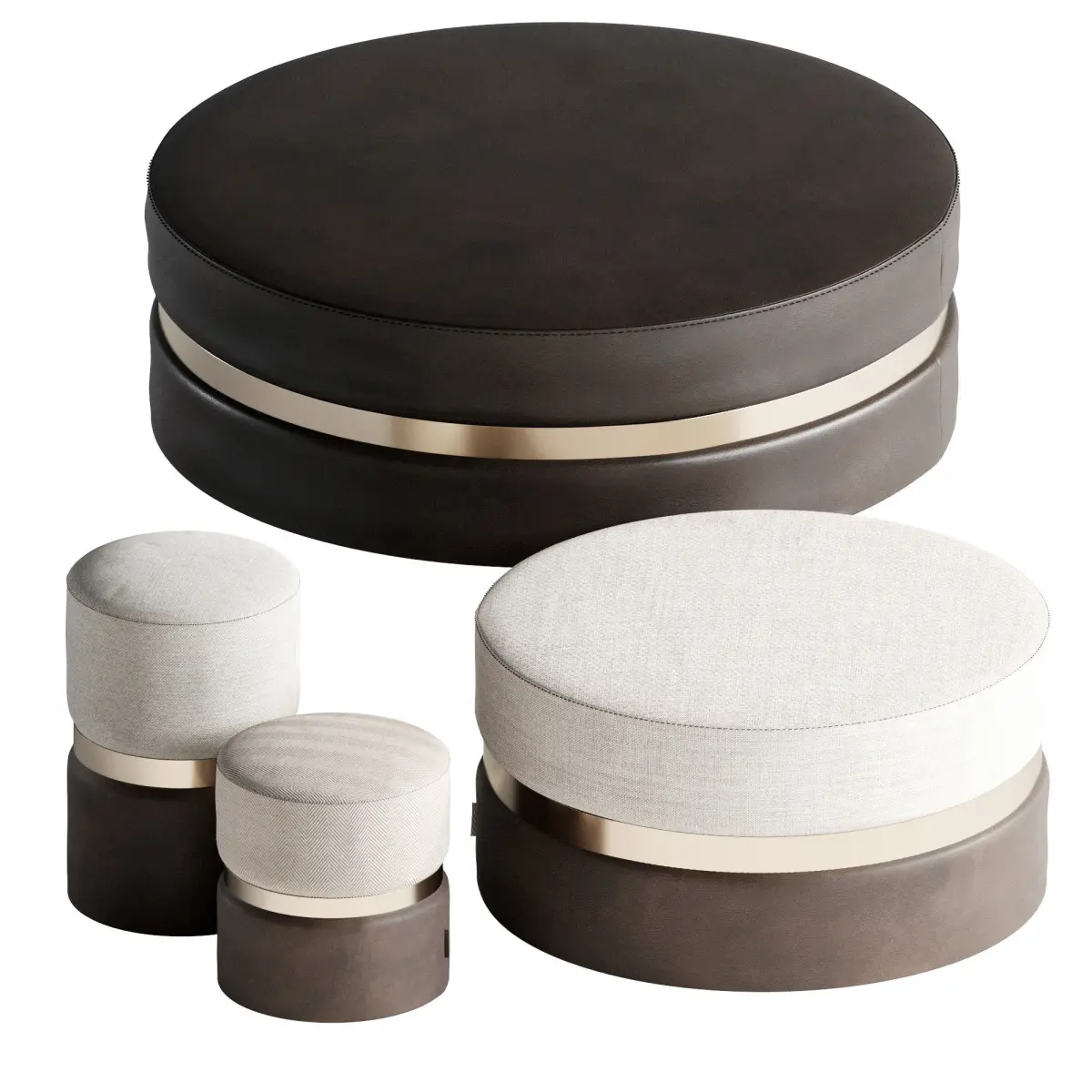 The pouffe is upholstered in two different fabrics with a metal strap that matches and interacts between the two hemispheres of this product, a modern contemporary and elegant look.