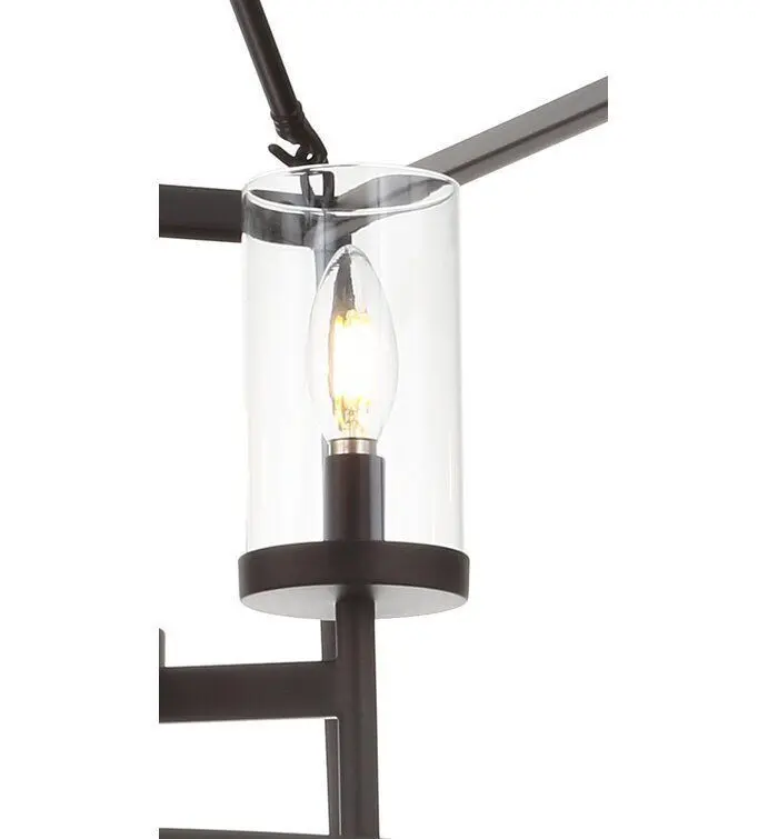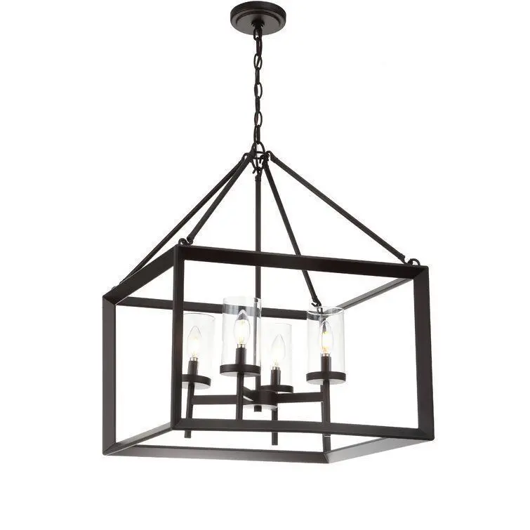 - Illuminate your space in modern farmhouse style with this four-light chandelier! Crafted of metal in an oil-rubbed bronze finish, this fixture features an open rectangular frame. Topping streamlined torches, four cylindrical clear glass shades ensconce 40 W C35 candle-style bulbs (not included) to diffuse 420 lumens of bright light as it’s dispersed throughout your space. An adjustable length of chain suspends the unit from a matching canopy above to round out the design.