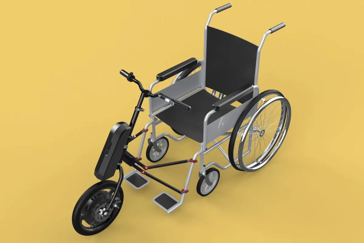 This innovative device enhances the capabilities of a standard manual wheelchair by adding electric power assistance.
