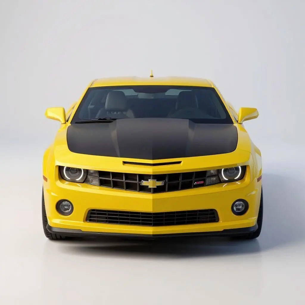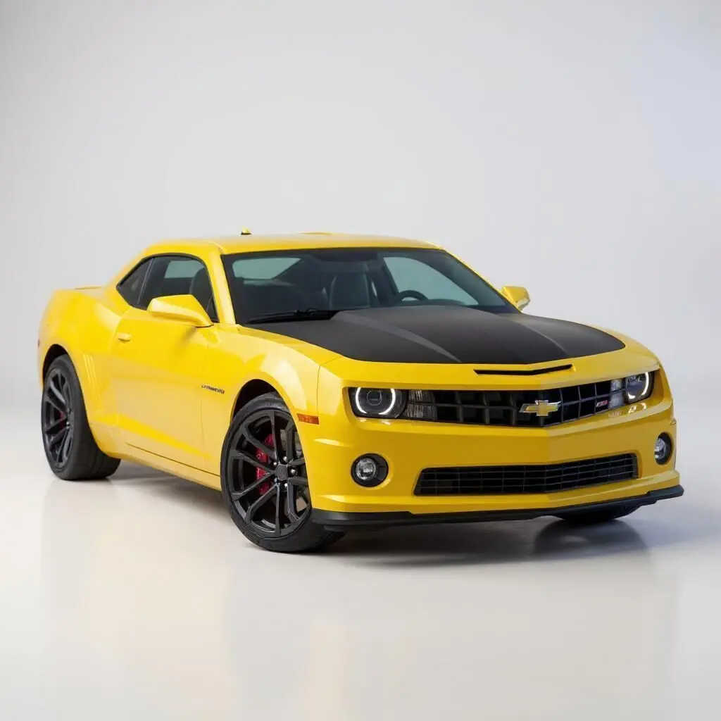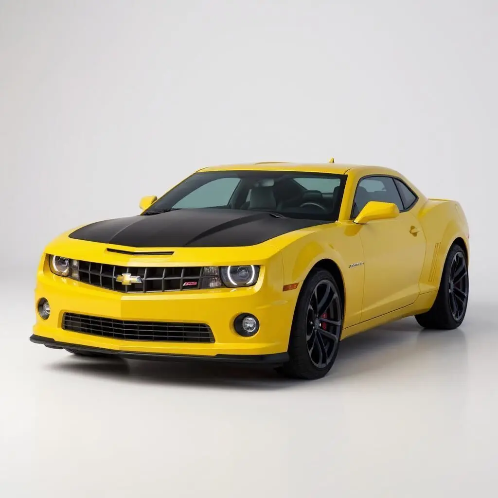 This image showcases a striking yellow Chevrolet Camaro SS parked on a racetrack. The car features a black hood with aggressive styling, modern halo headlights, red brake calipers, and sporty black alloy wheels. Set against a winding track and green landscape, the muscle car radiates performance, speed, and bold design.