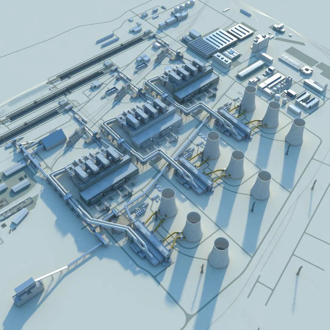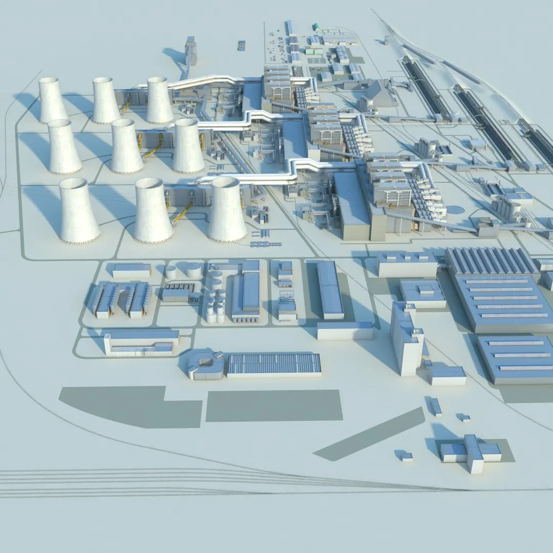 Complex model of power plant station, including buildings, warehouses, railways, power lines, train, and infrastructure.