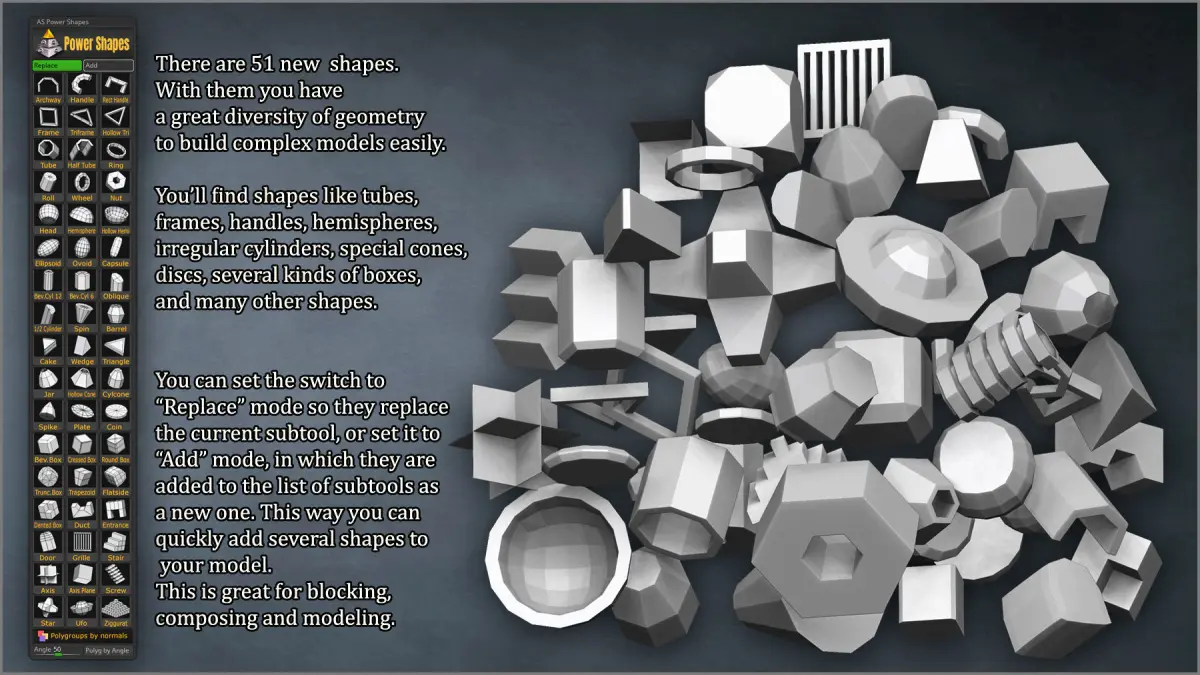 Power Shapes is a ZBrush plugin that adds a palette with 51 shapes to ZBrush, and some useful functions to help you in low poly modeling: