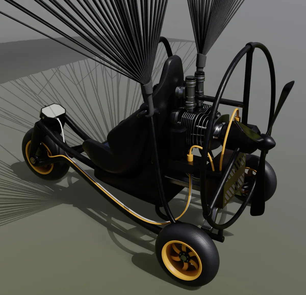 A powered paraglider with a striking yellow and black color scheme, featuring a sturdy harness and a powerful motor, ideal for adventurous individuals looking to soar through the skies in the current timeline.