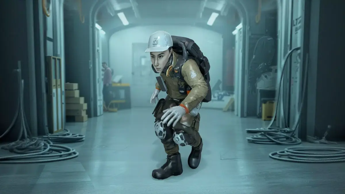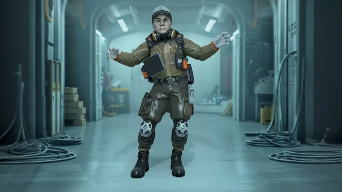 A practical robot maintenance technician with average athletic proportions and a clean, readable silhouette, lightly oil-stained skin, and a focused expression; short hair under a hard cap with a flip-down visor, and a compact respirator resting at the neck; wearing layered workwear with a fitted undersuit, reinforced utility jacket, padded knee work pants, and scuffed magnetic boots, with grime and grease at cuffs and seams; spare actuator modules and cable cartridges secured in a backpack frame, a diagnostic tablet holstered on the thigh, and a compact tool roll clipped to the belt, plus a spare sensor housing attached to the shoulder strap. In an industrial service bay with a maintenance gantry, coiled cables on the floor, and cool white overhead lighting with soft haze; “Full-body, centered, fully visible in frame; standing upright in a T-pose with arms extended straight out to the sides; palms facing the camera (open palms); hands empty; match the provided OpenPose reference; PBR-friendly materials.”.