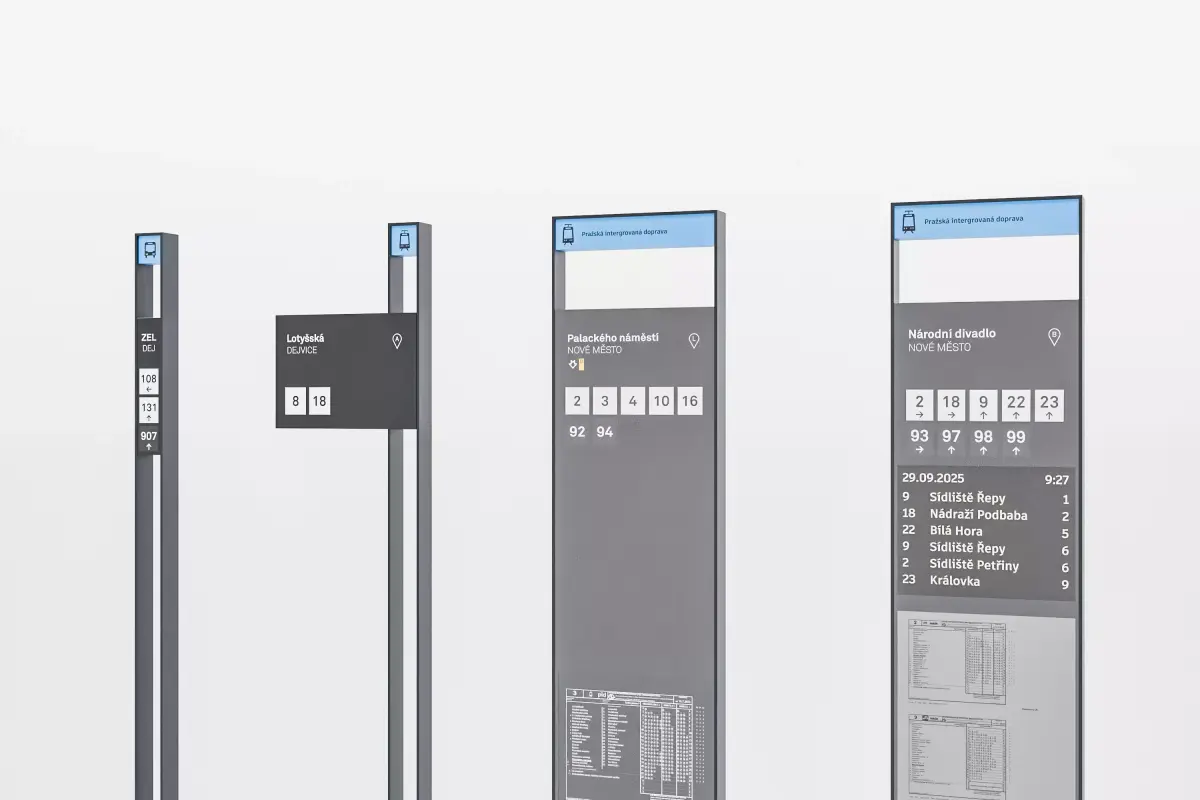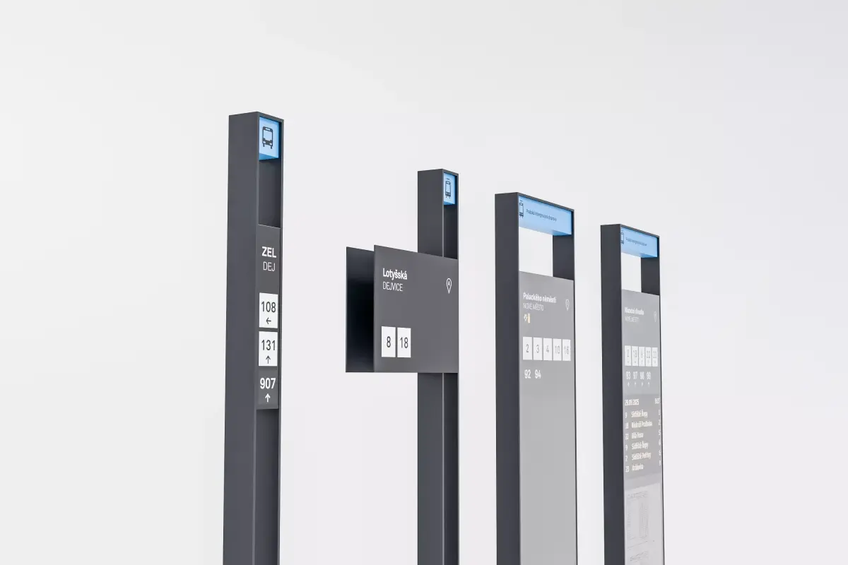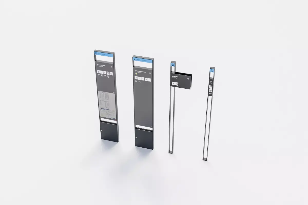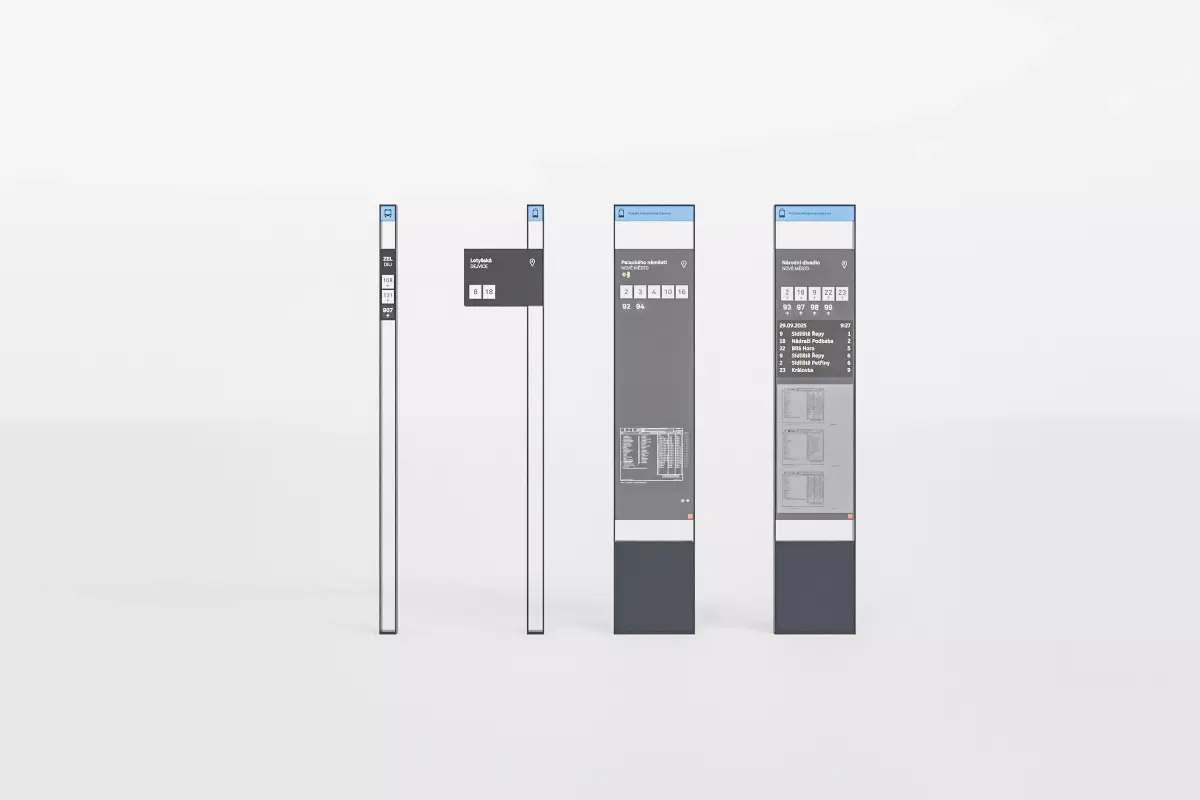 Set of fictional tram and bus stop signs. Design is based on existing street furniture used in the city.