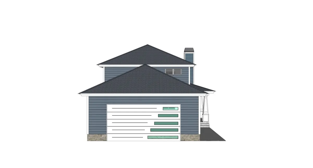 This Prairie-style duplex blends modern and traditional elements, ideal for single-family homes in narrow, scenic areas. It features three bedrooms, 2.5 bathrooms, and a 2-car garage. The welcoming covered entrance leads to a spacious living room, formal dining area, and a kitchen with modern appliances, a butler's pantry, and an eating bar. The master suite offers a stylish bathroom with a vanity sink, shower, and dressing closet. Two additional bedrooms and a shared bath are on the upper level. This two-story, three-bedroom house is perfect for those who enjoy spending time with friends.