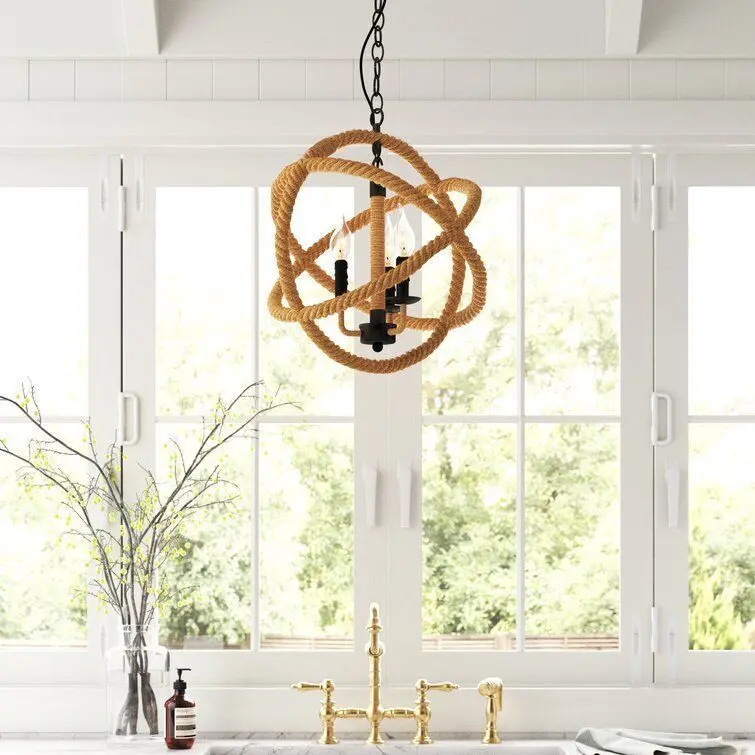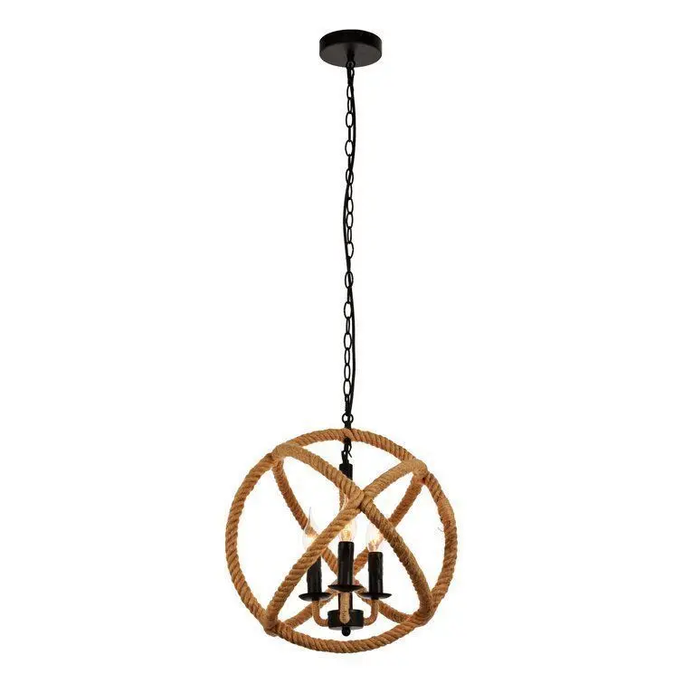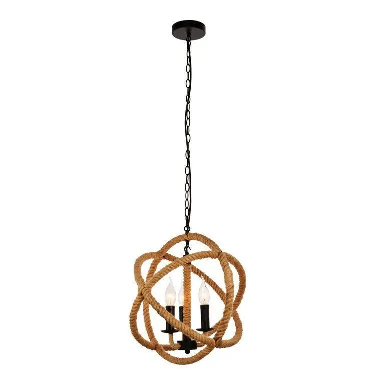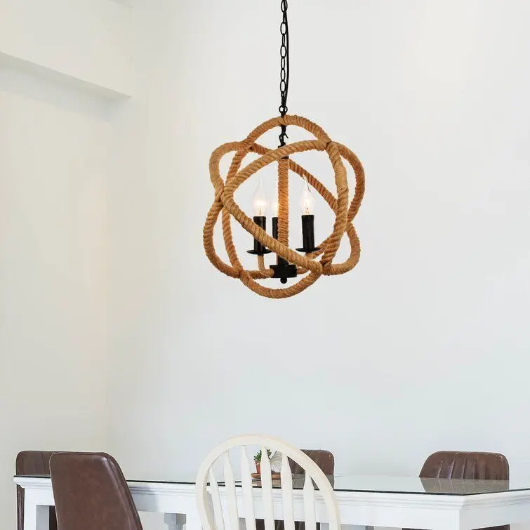 - This 3-light globe chandelier is made of materials that bring the open seas into your home — perfect for entryways, bedrooms, or your living room. It hangs from a height-adjustable chain and has an open frame made of rope, with metal in the candle holders and part of the central fixture.