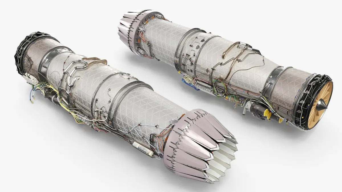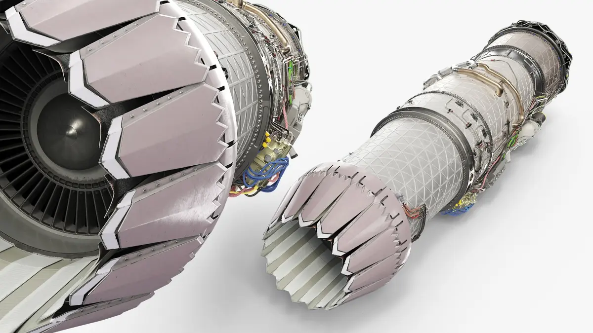 The model showcases the intricate design of the turbine, including the fan blades, casing, and surrounding components. It highlights the precision engineering necessary for efficient thrust production and energy conversion. The detailed surface textures replicate metal surfaces, wiring, and other key elements, offering an authentic representation of modern jet engines.