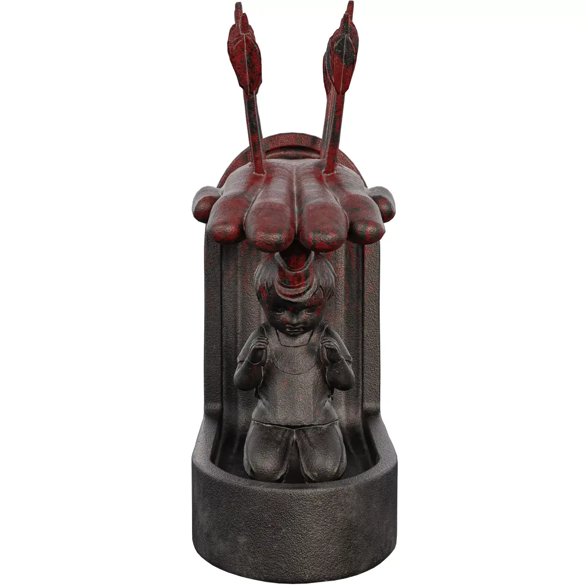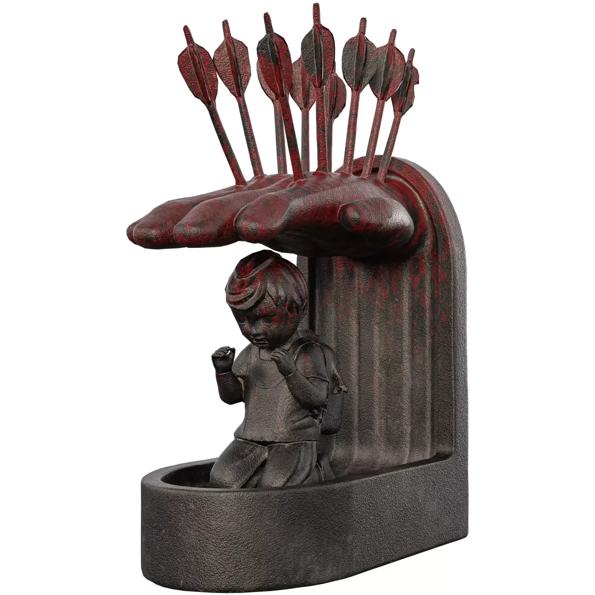 Name: Prayer Boy StatueType: modelFormat: 3Ds Max 2013Export: FBX, OBJRender: VRay (5.x), Corona (9)Polys: 14854Verts: 14838Matclasses: VRayMtl,_CoronaPhysicalMtlUnits: CentimetersDimension: 72.12 x 38.81 x 99.7Date: 2025.8.25This premium 3D model offers a highly detailed and poignant representation of an abstract sculpture. The piece depicts a child in a prayer pose, wearing a backpack, kneeling beneath a large, protective hand. A cluster of stylized arrows pierces the hand's surface, adding a powerful symbolic layer to the sculpture. The model features a raw, weathered metal or stone texture with a dark, moody finish, creating a profound and emotional presence. This commanding and artistic asset is perfect for adding a touch of solemnity, emotion, and historical depth to any scene. High-Quality Sculpt and Textures: The model is created from a high-resolution sculpt, capturing the intricate details of the boy's form, the texture of the hand, and the fletching on the arrows. The PBR (Physically Based Rendering) textures are meticulously crafted to provide a photorealistic look, with accurate maps for color, roughness, and normal detail that highlight the aged and distressed finish.
