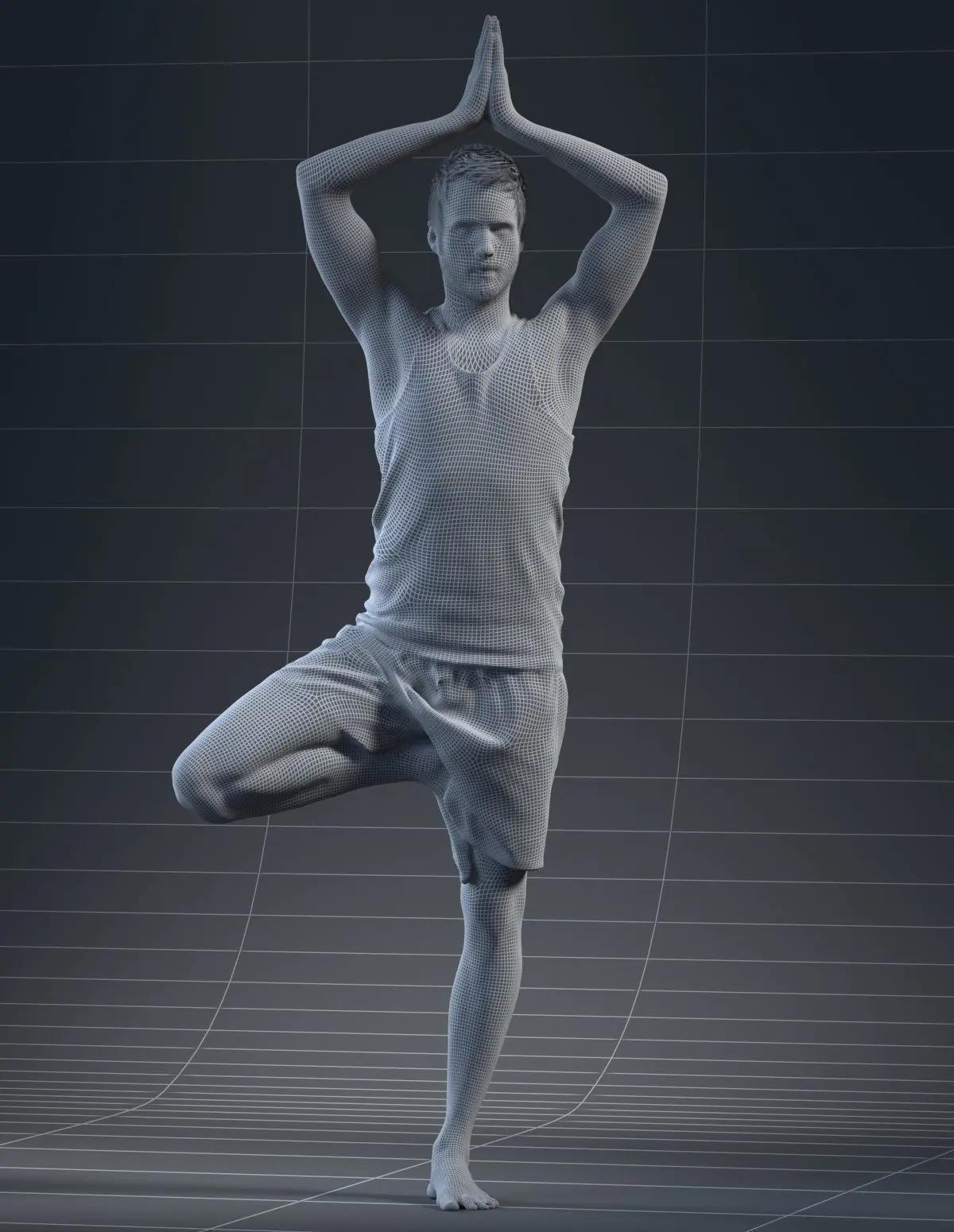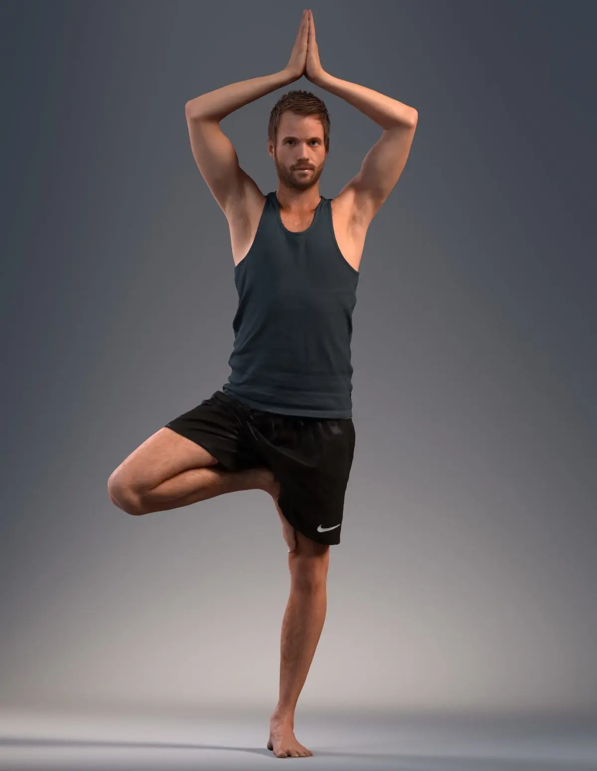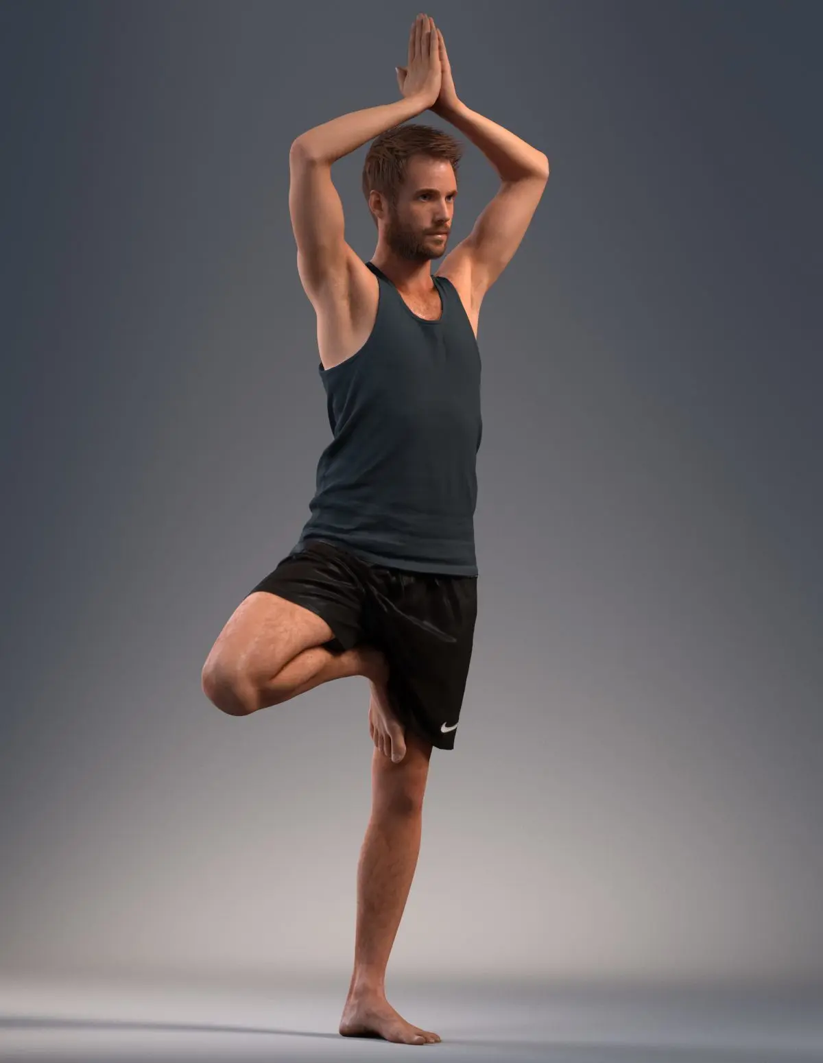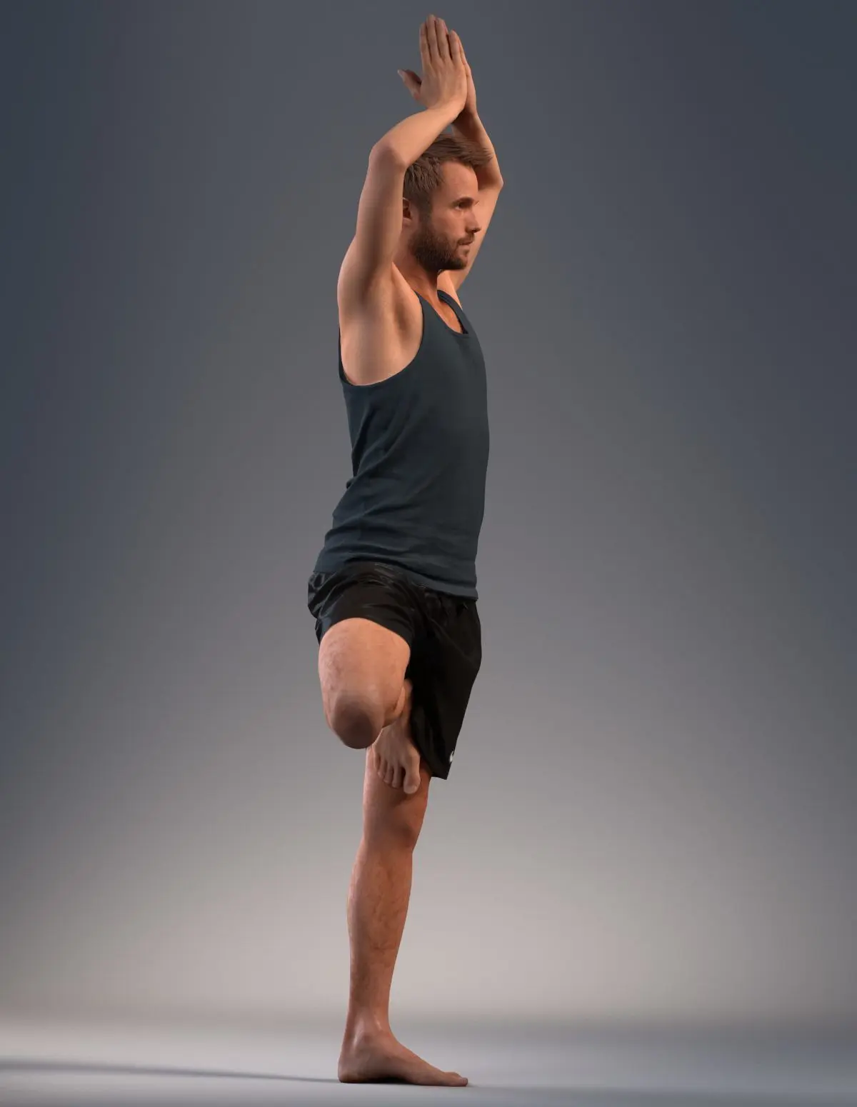 Pre posed male 3D model in a sport attire wearing shorts and blue shirt doing yoga in a Vriksasana pose.