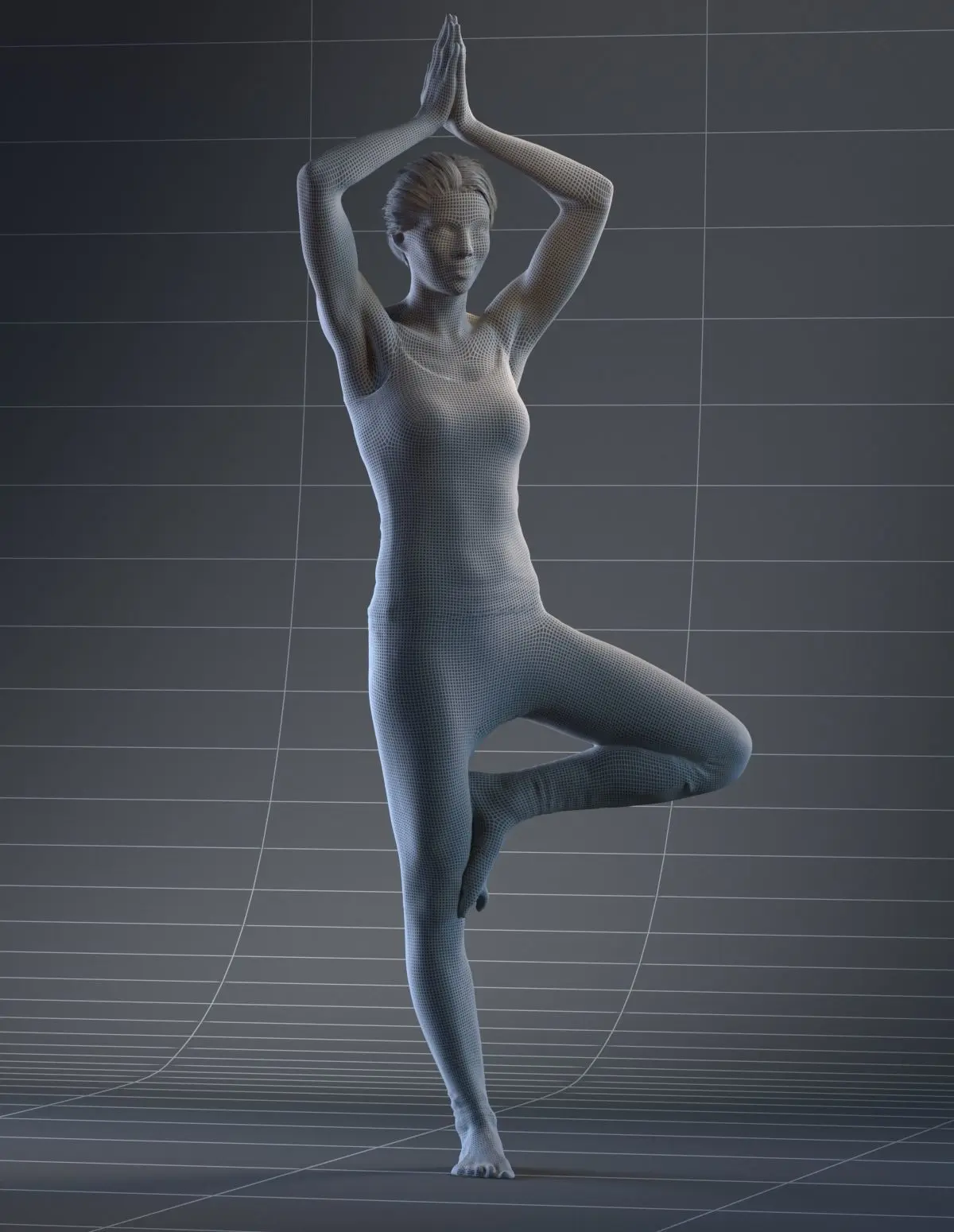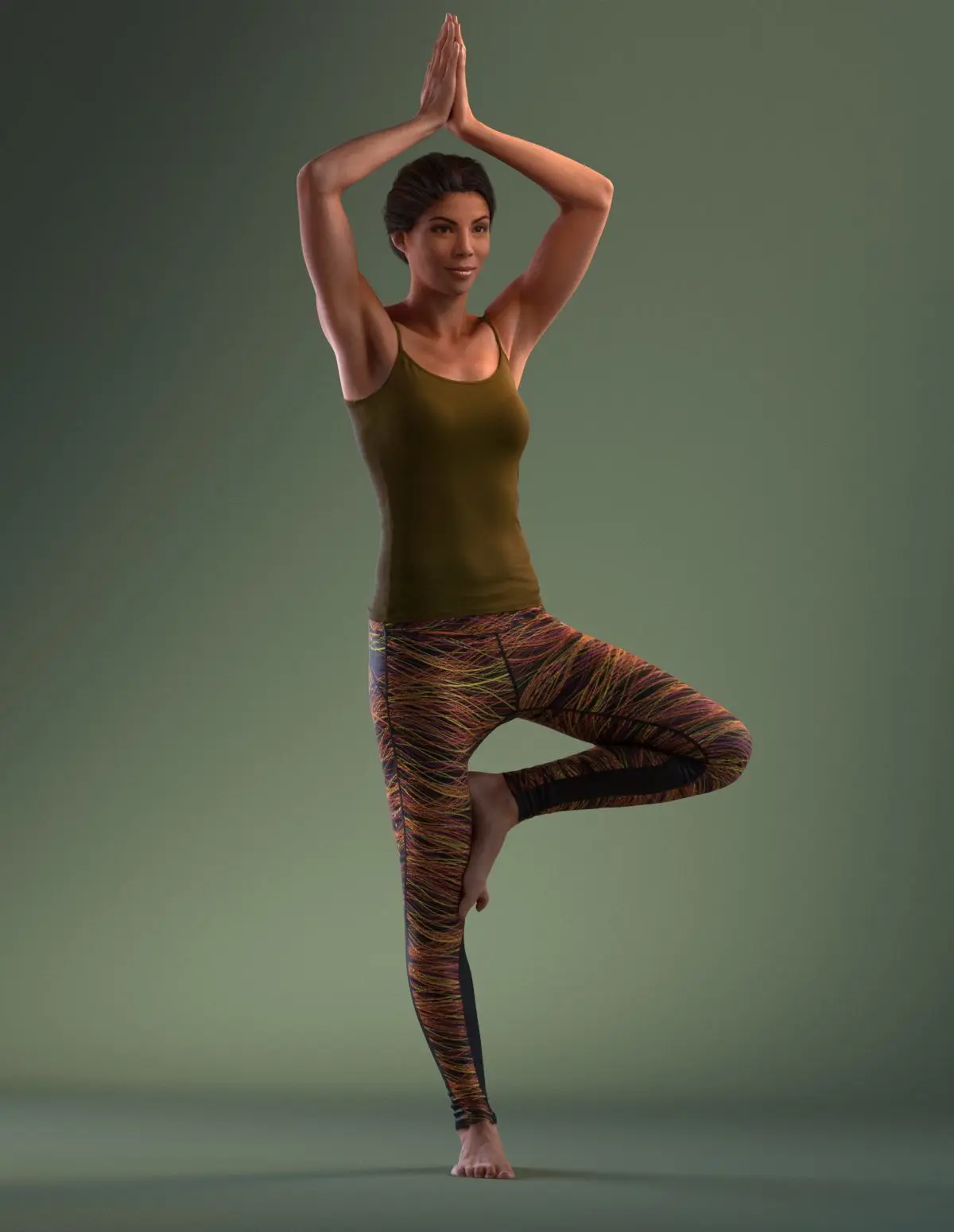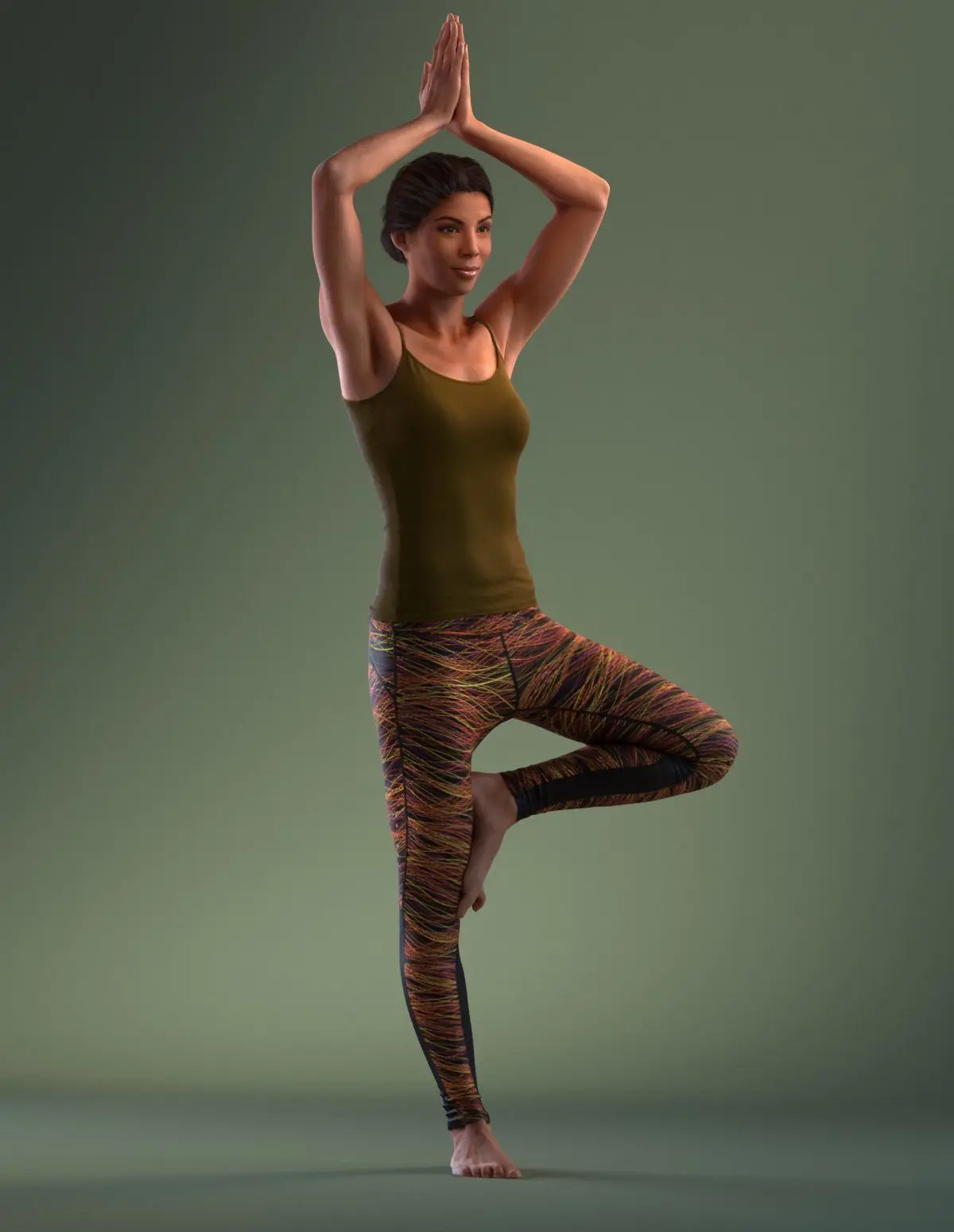 Pre posed south American female 3D model in sports attire doing a vrksasana yoga pose