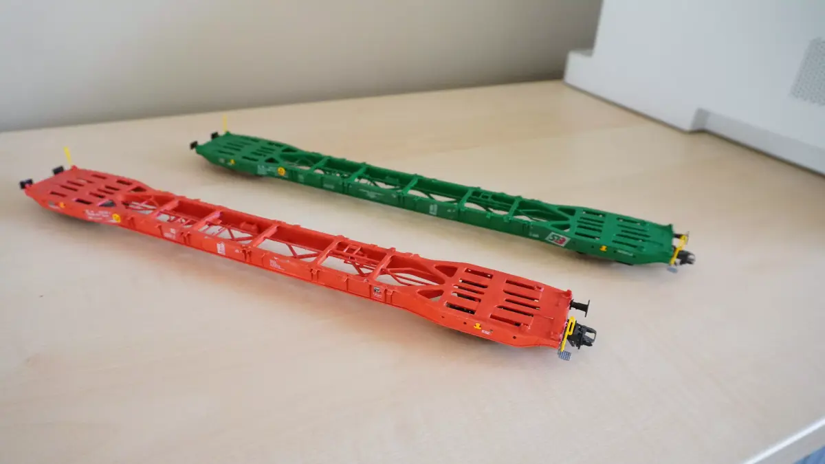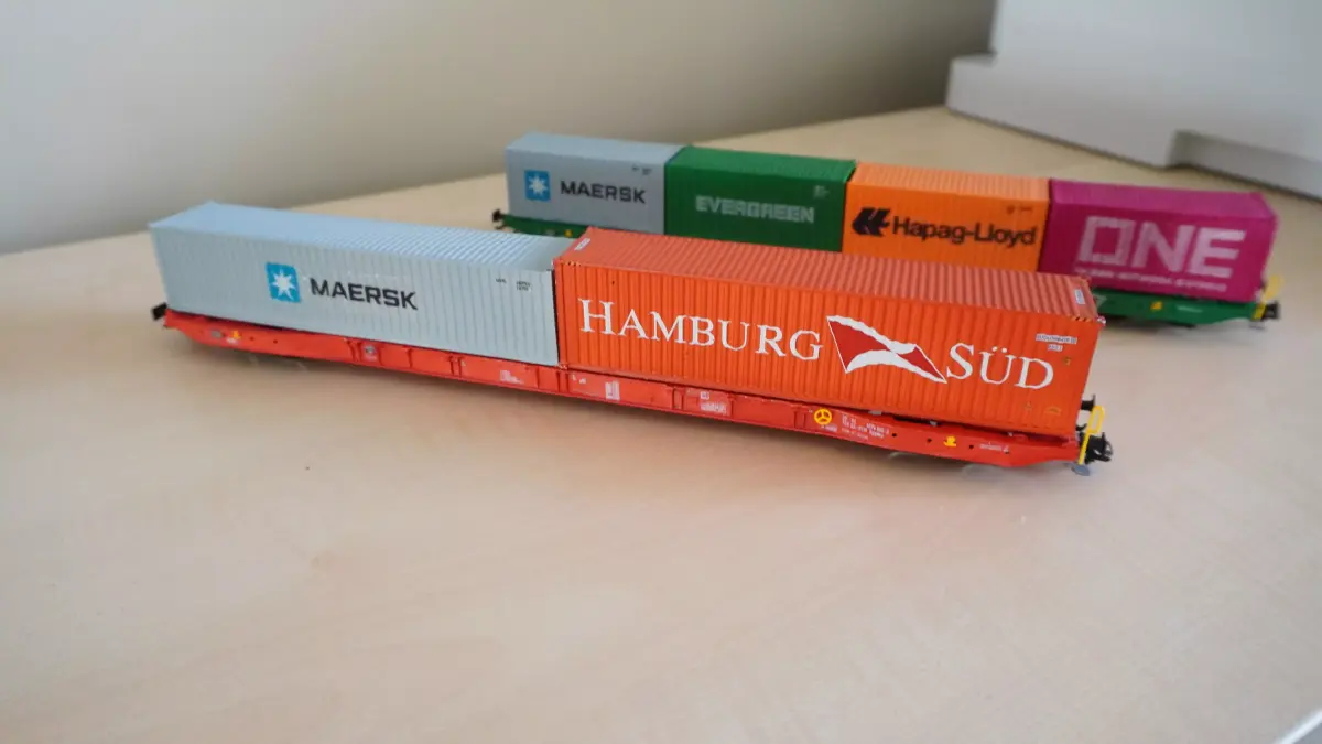 Der Sggnss-XL ist ein verlängerter Containertragwagen, ausgelegt für den Transport von 20ft-, 40ft- und 45ft-Containern. Das Modell wurde so konstruiert, dass es zuverlässig auf Anlagen mit einem Mindestradius von 360 mm läuft – ideal also auch für kompaktere Modellbahnlayouts.