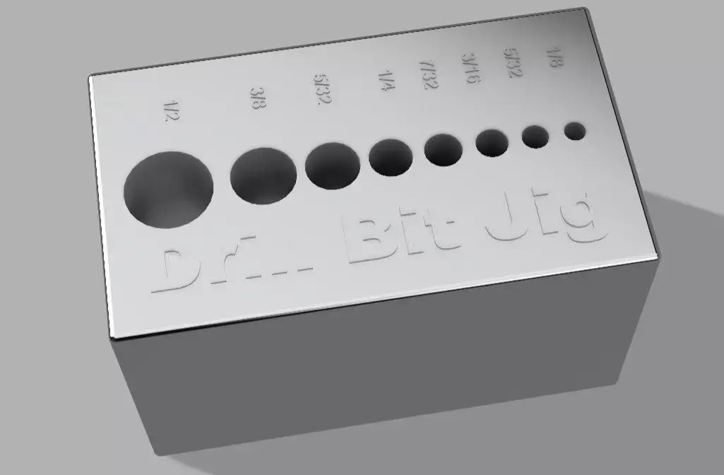 The drill guide jig features a compact 1.75 × 3.00 × 1.00 inch body with eight integrated guide holes for common imperial drill bit sizes: 1/8, 5/32, 3/16, 7/32, 1/4, 5/16, 3/8, and 1/2. Each guide hole is precisely aligned to help produce straight, repeatable holes in wood, plastics, and light metals.
