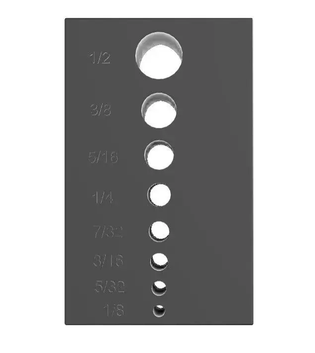 The compact yet rigid body provides stability during drilling while remaining easy to clamp to a drill press table or workbench. Integrated drill guide holes accommodate the most commonly used imperial drill bit sizes, helping reduce bit wander and improve repeatability. The flat base and symmetrical design allow for reliable positioning and consistent results.