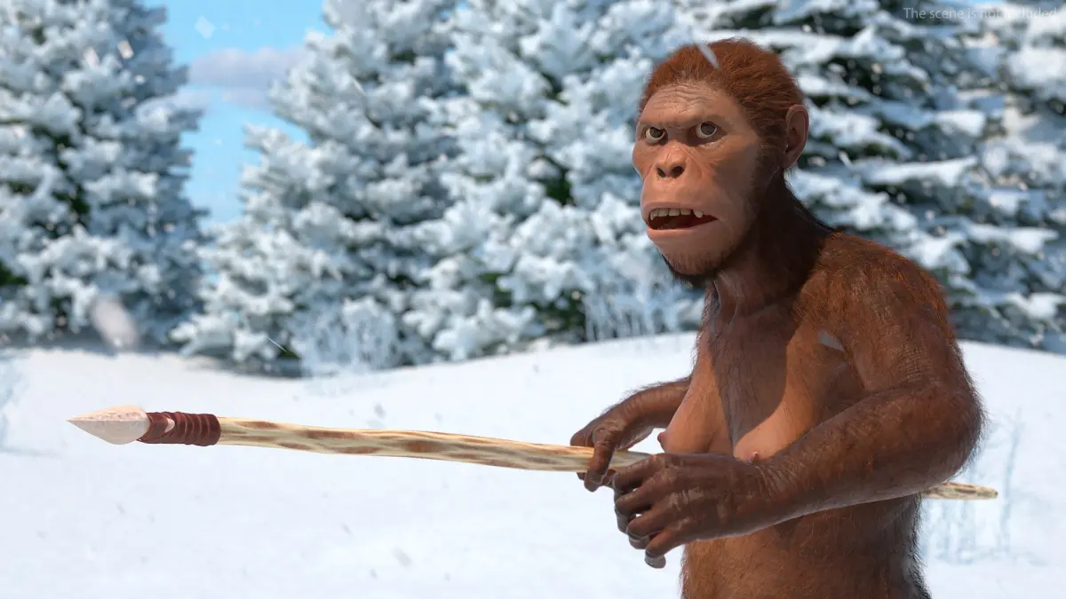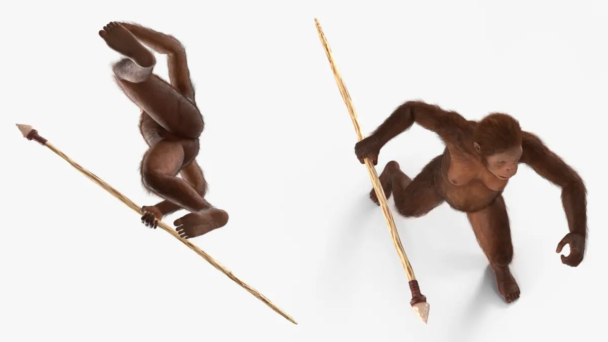 This realistic hominid model features detailed fur coverage, anatomically accurate muscle structure, and expressive facial features to convey alertness and readiness. The spear includes hand-crafted textures imitating wood grain and leather binding, enhancing the model’s authenticity and utility in visual storytelling or academic renderings.
