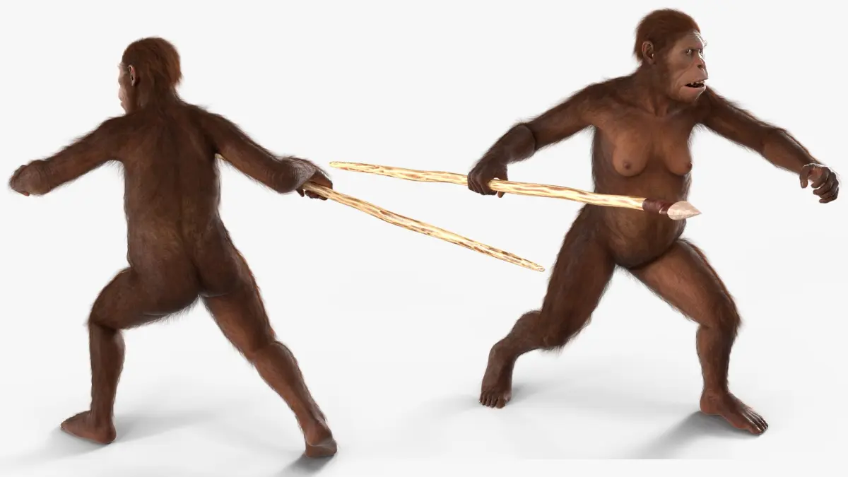 Prehistoric Hominid with Wooden Spear Fur for Cinema 4D is a three-dimensional model of an early human ancestor posed in a dynamic hunting or defensive stance, holding a primitive wooden spear tipped with a sharp stone.