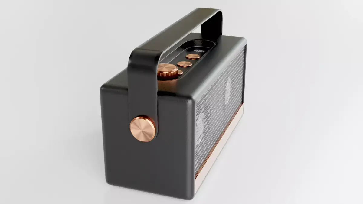 Immerse in the craftsmanship of this 4K ultra-realistic 3D rendering of a retro-chic wireless speaker, designed for the discerning listener. The speaker’s body features a deep charcoal finish enhanced by cosmopolitan copper accents, giving it a refined industrial-luxury aesthetic. High-resolution PBR textures reveal subtle metal grain, mesh detailing, and soft ambient reflections — every surface treated with studio-grade precision.