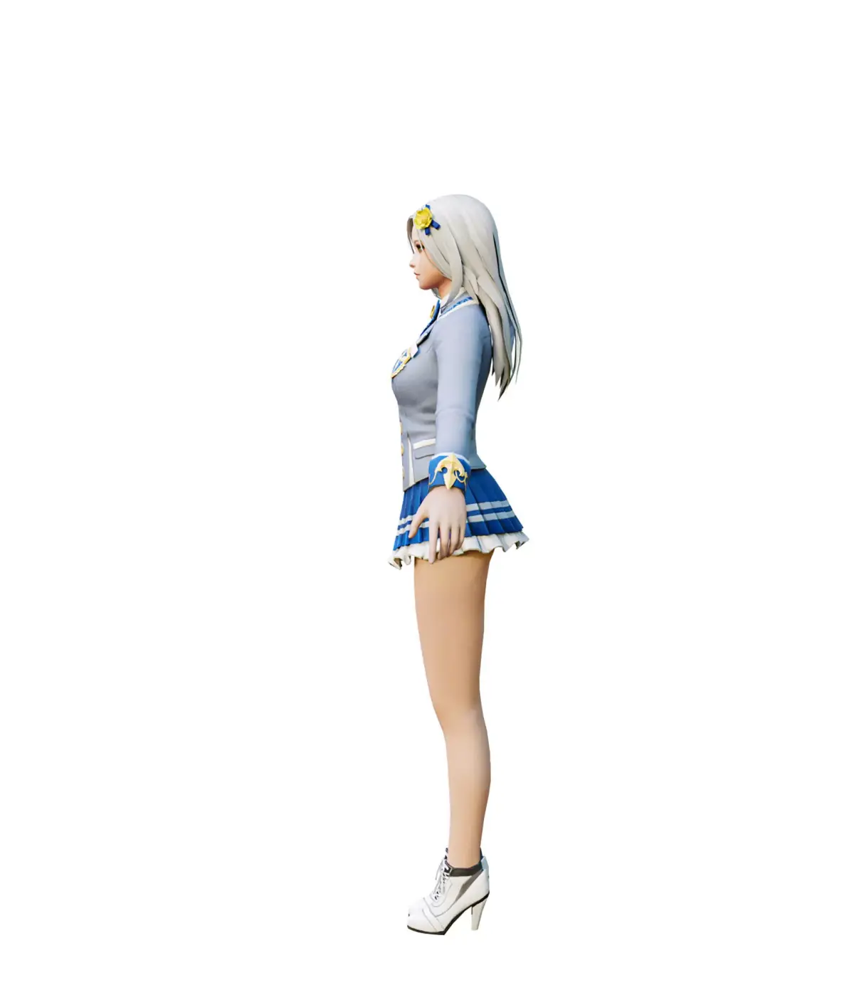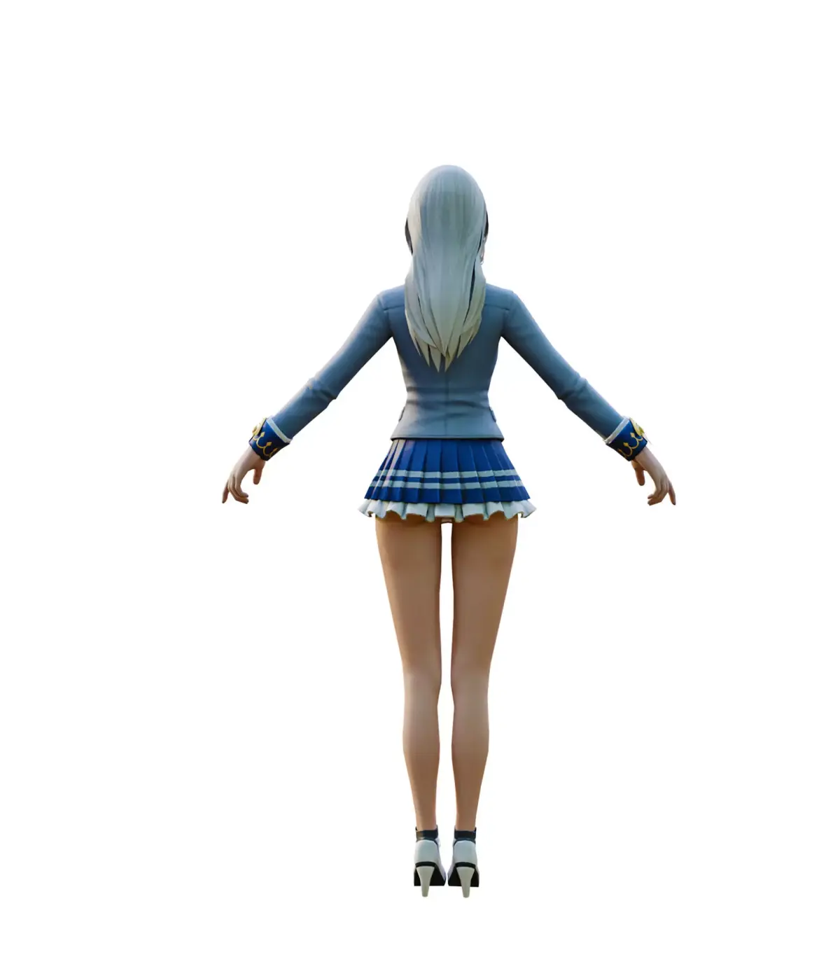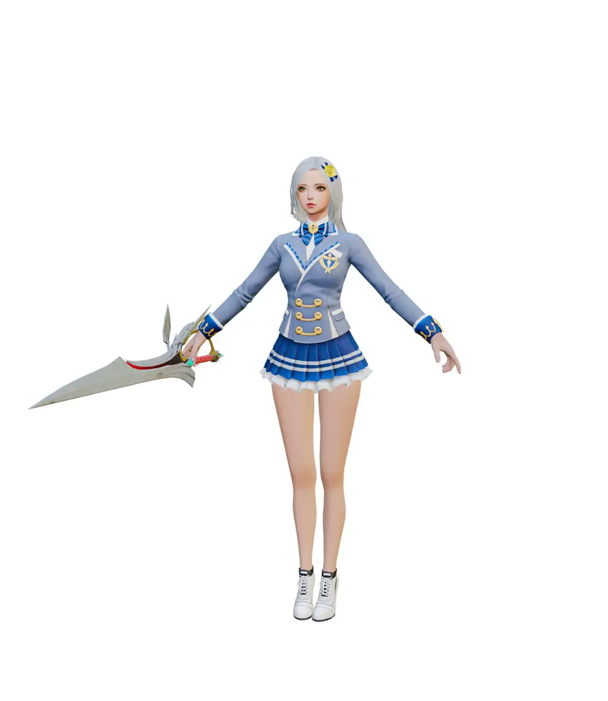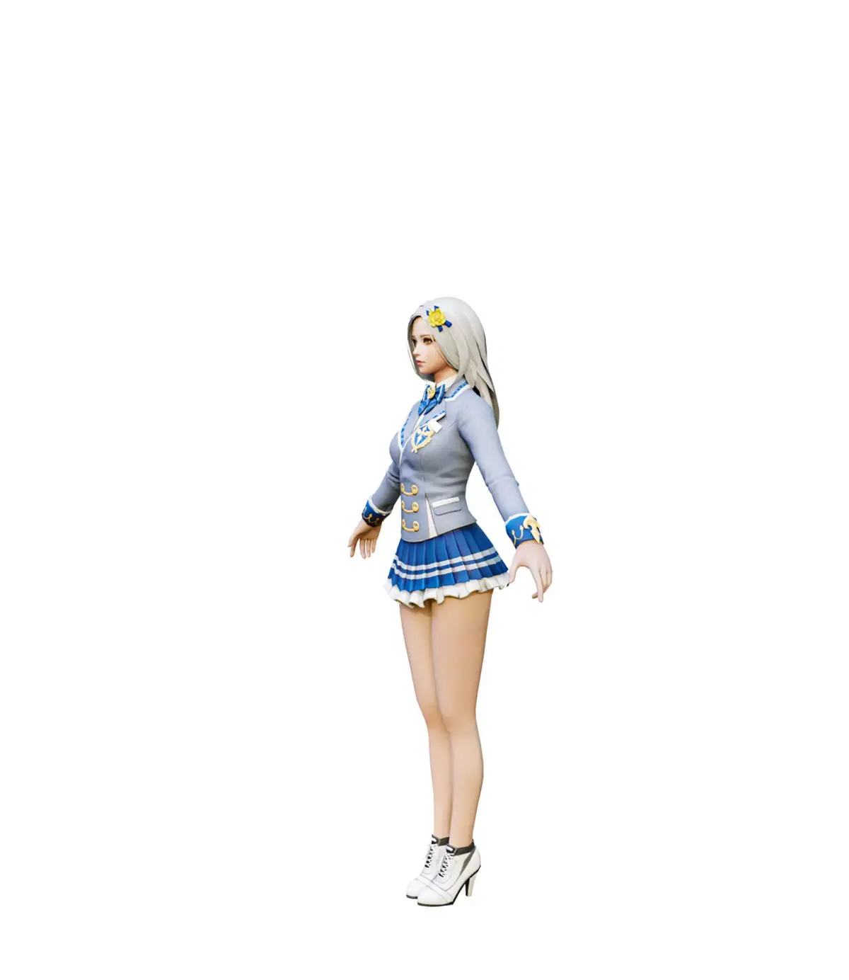This is a 3D-rendered female character wearing a blue-and-gray academy-style uniform, which includes a tailored jacket with gold decorative details, a blue-and-white striped pleated mini skirt, and white sneakers. She has long light gray hair with a yellow hair accessory, standing in a T-pose (arms slightly spread) against a pure white background.