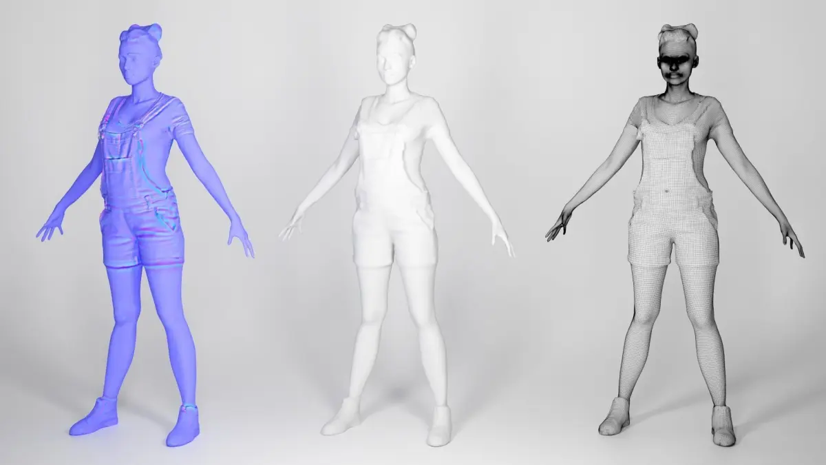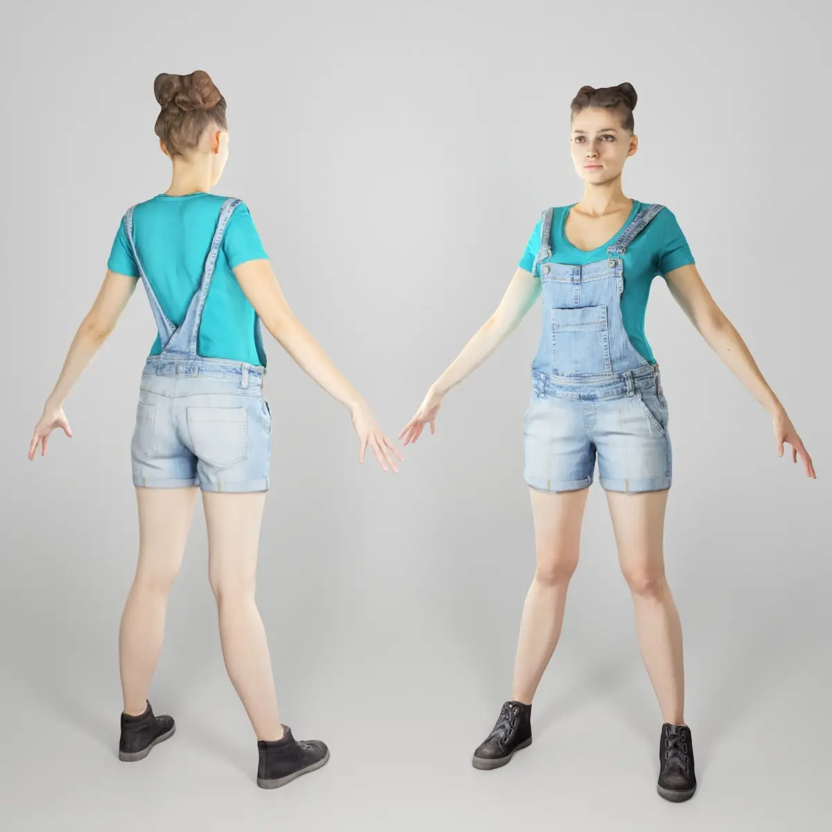 This is a true human size detailed model of a young beautiful woman of Caucasian appearance dressed in casual style. The model is captured in the A-pose with mesh ready for rigging and animation in all most usable 3d software.