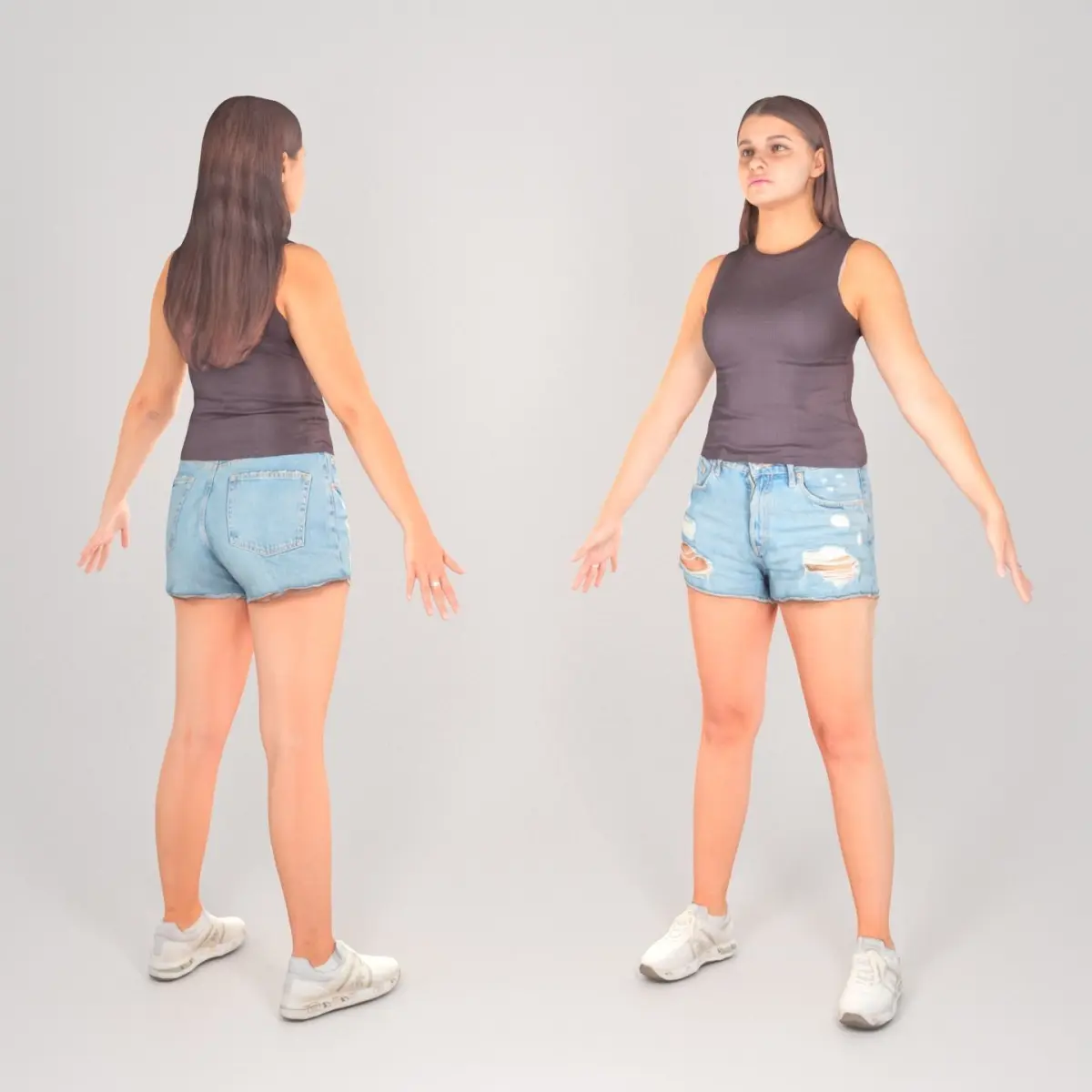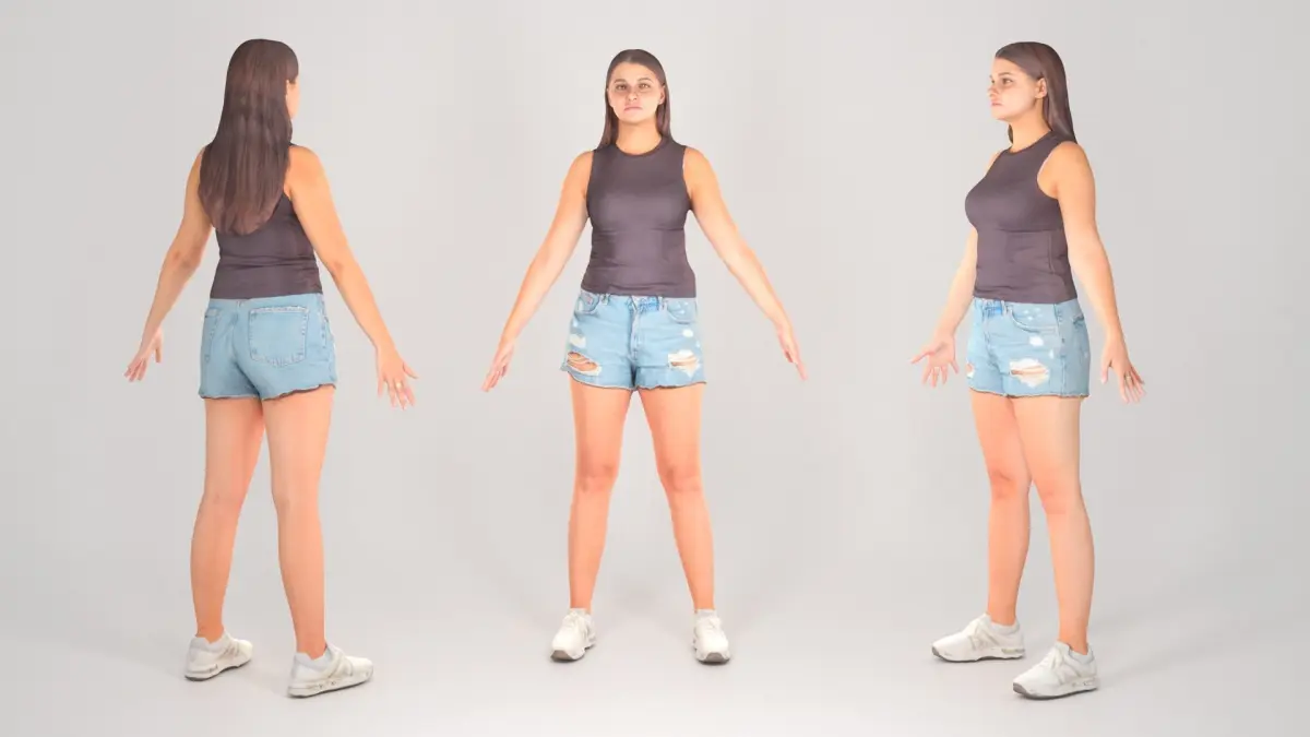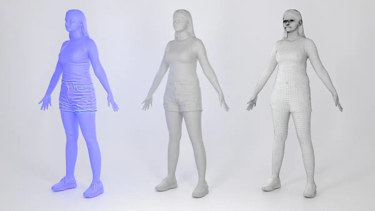 This is a true human size detailed model of a beautiful young woman of Caucasian appearance dressed in casual style. The model is captured in the A-pose with mesh ready for rigging and animation in all most usable 3d software. The product is ready for immediate use in architectural visualisations, inside Game Engines or for further render and detailed sculpting in Zbrush.