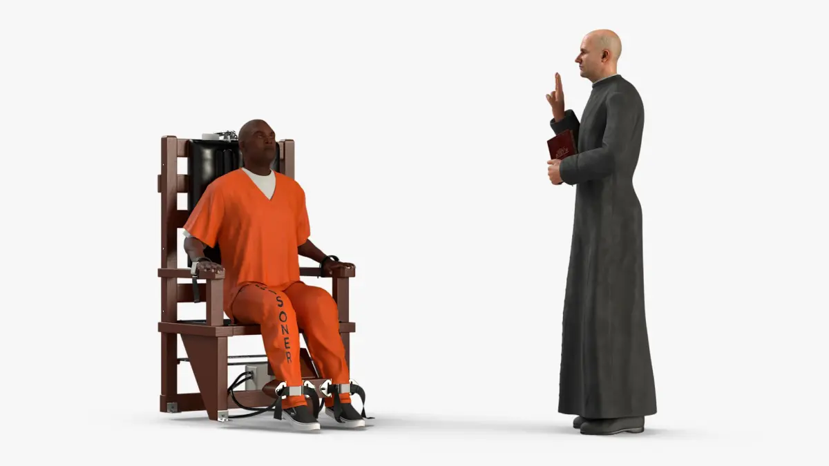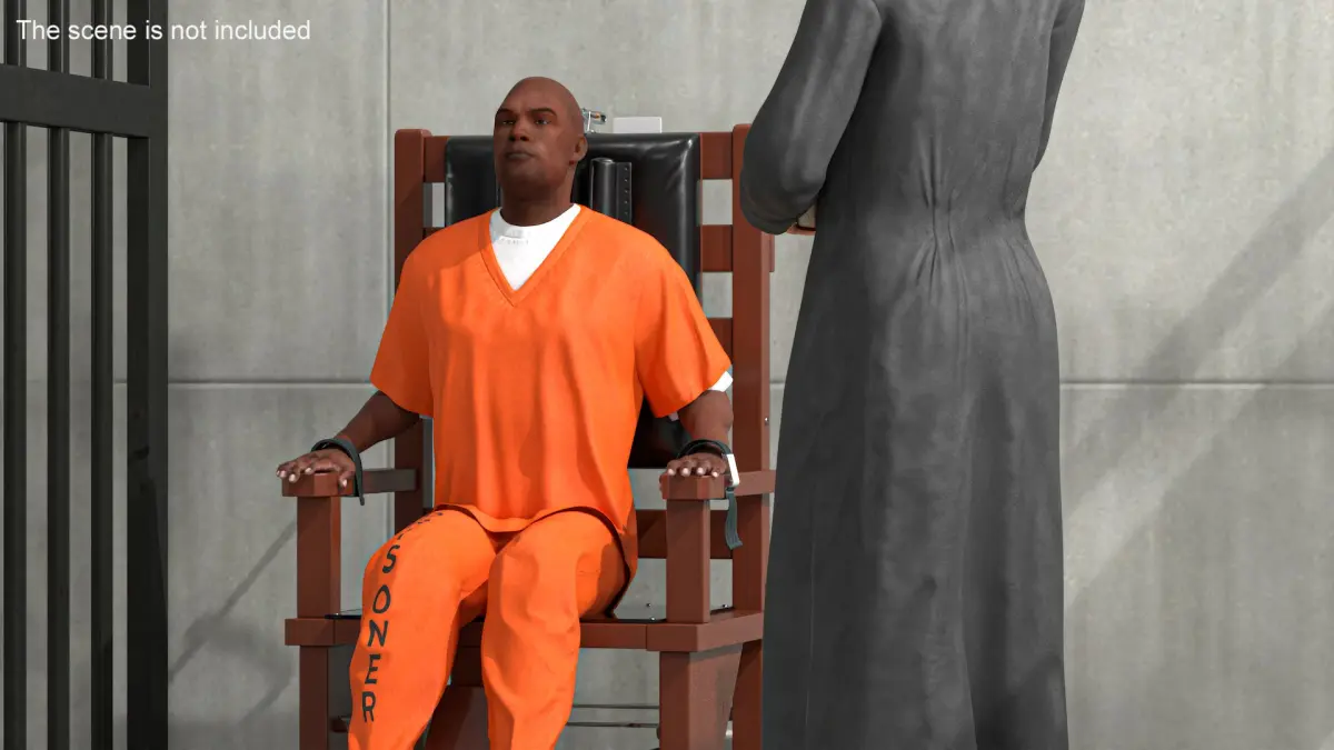 This model captures the gravity of the moment, with the prisoner dressed in an orange jumpsuit, seated in an electric chair, and a priest standing beside, holding a Bible and raising a hand in blessing. The details emphasize the solemnity and poignancy of the scene.