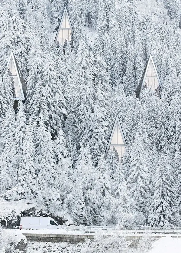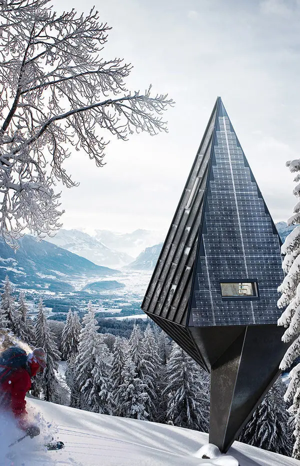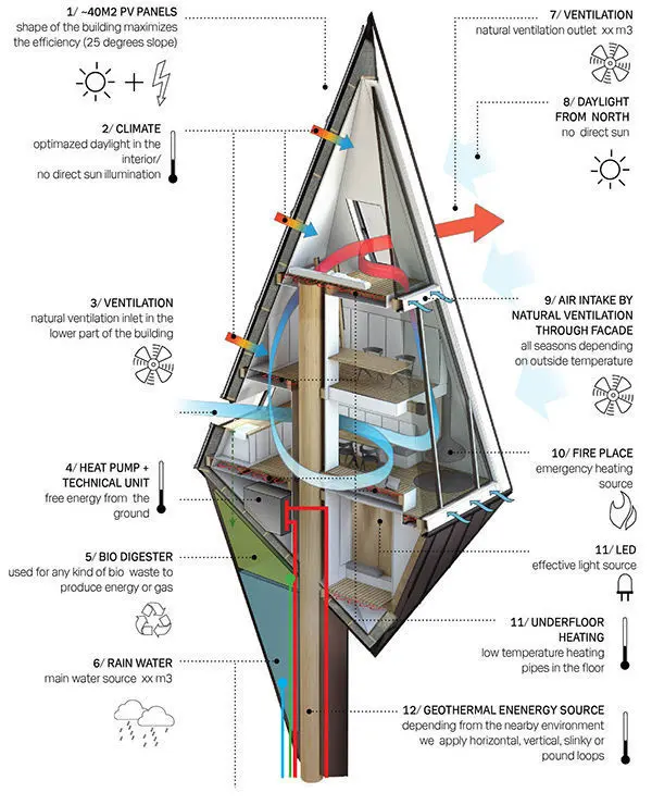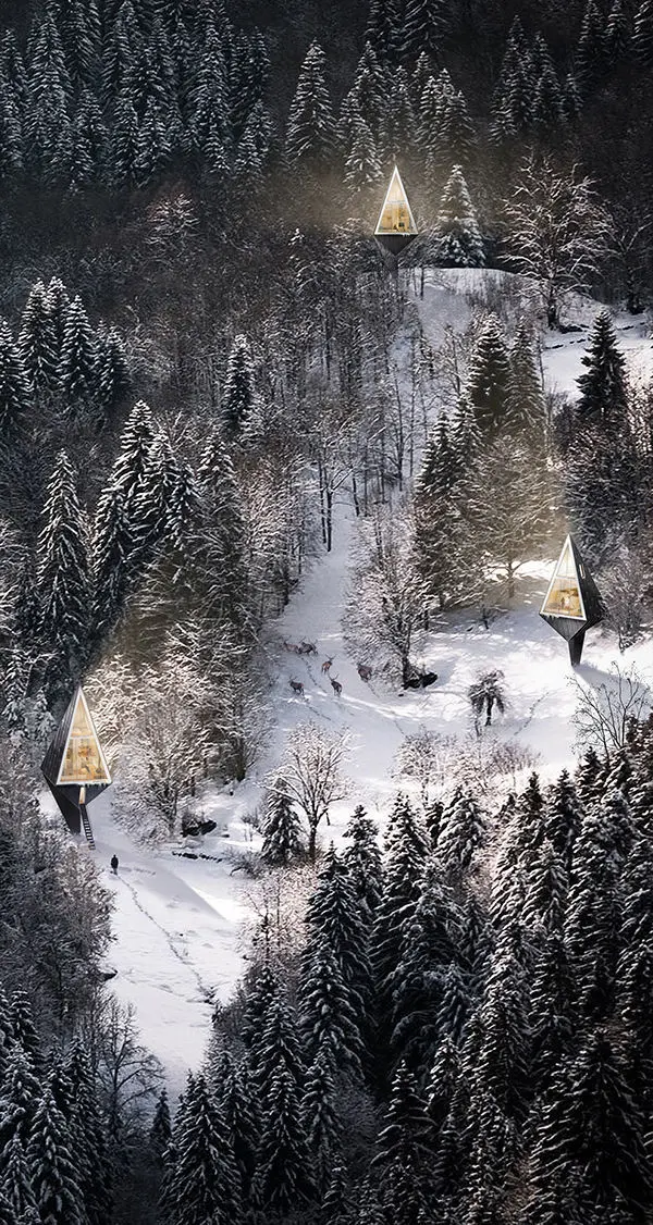 Wojcik's aim is to design a structure that would not have any footprint on nature. The fully functional interior is intended for two people and if needed, in special occasions could be extended up to four. In order to provide as much space as possible alternating threads stairs were implemented. This allowed fitting spacious interior into a compact and light form. Construction divides into 4 levels with a clear different functional program on each floor. This well-equipped structure is a balance of comfortableness and practicality.