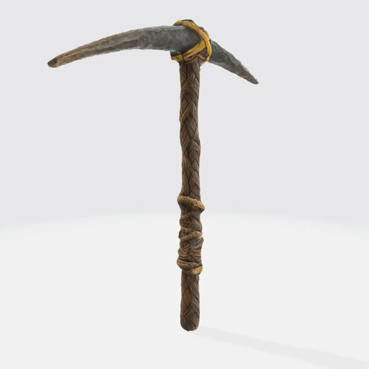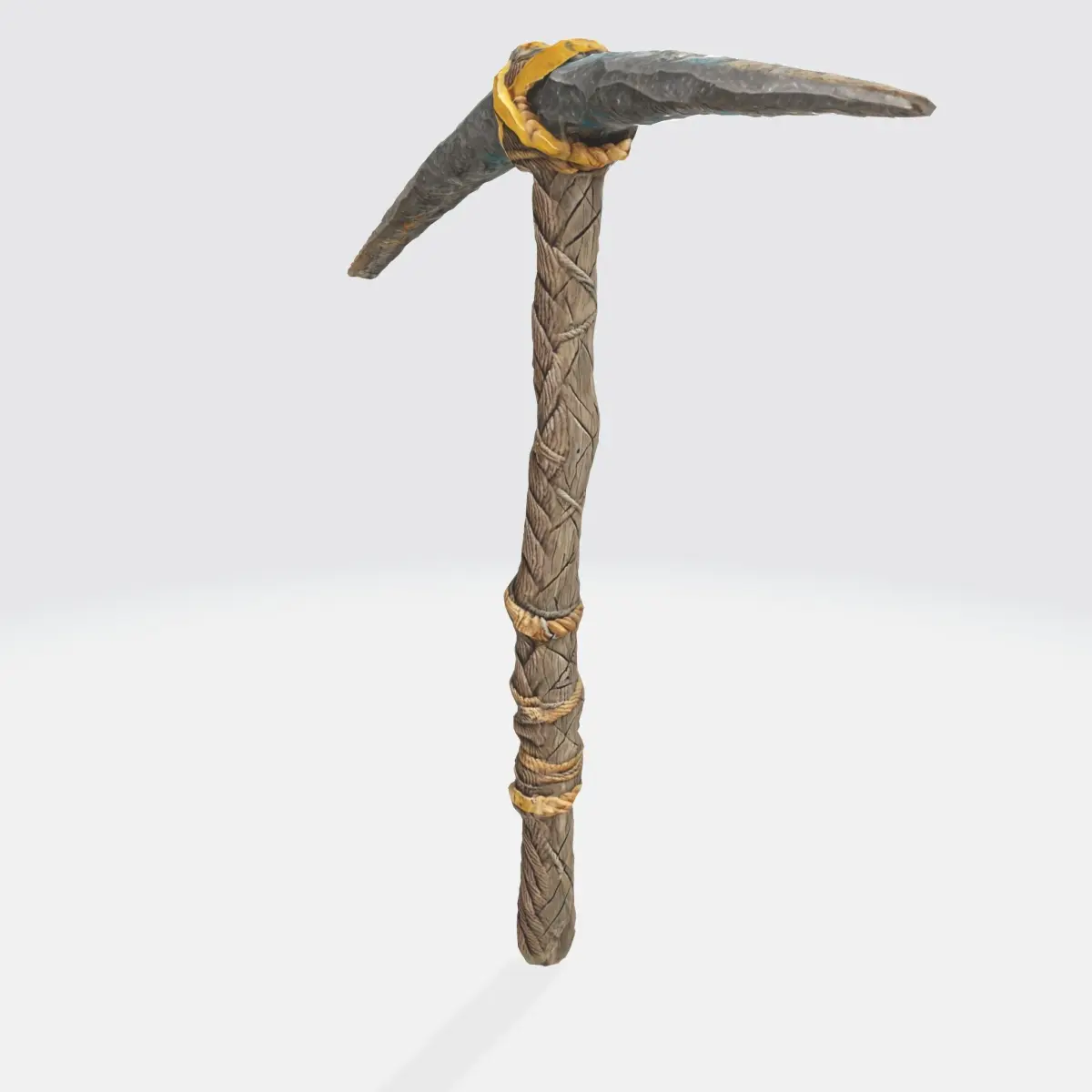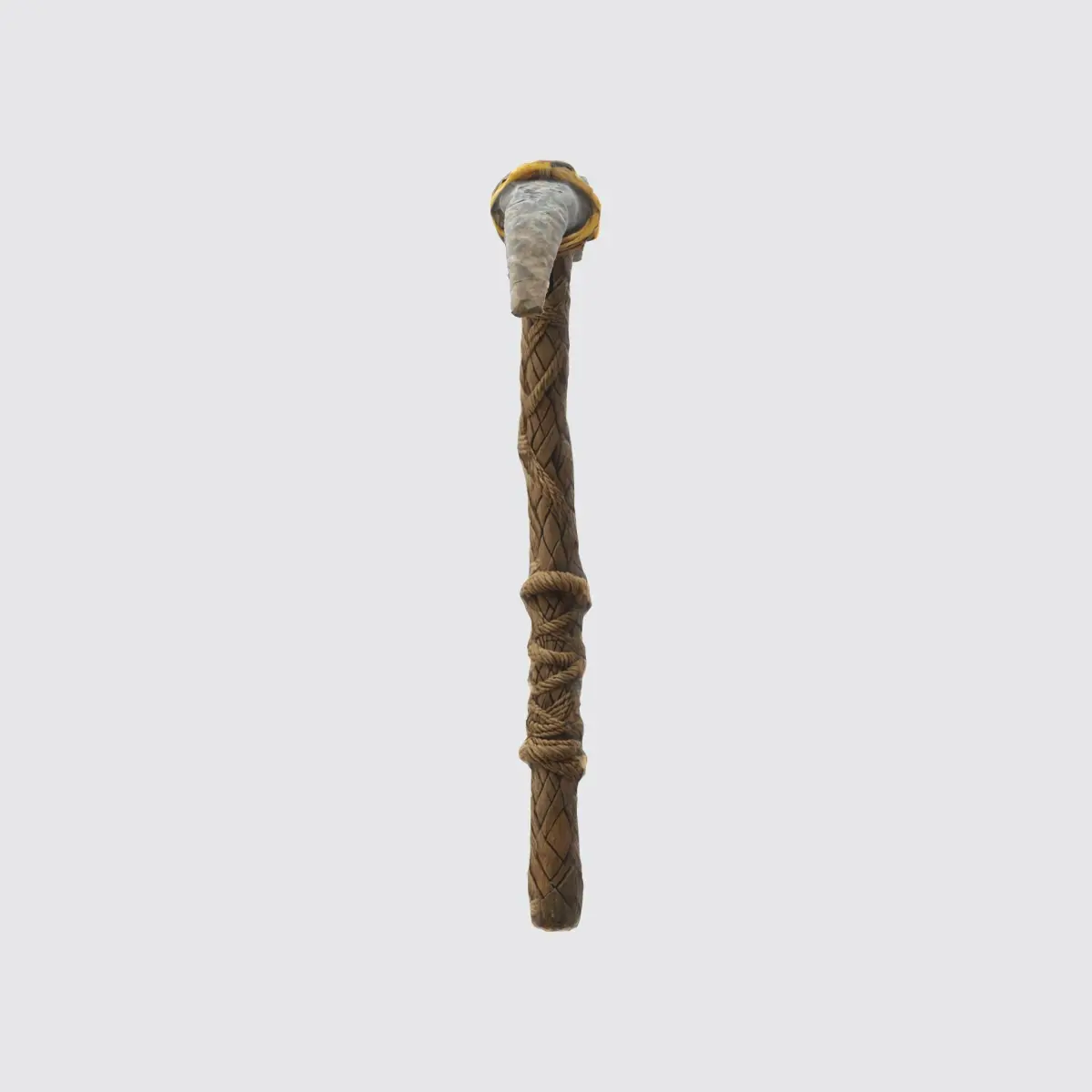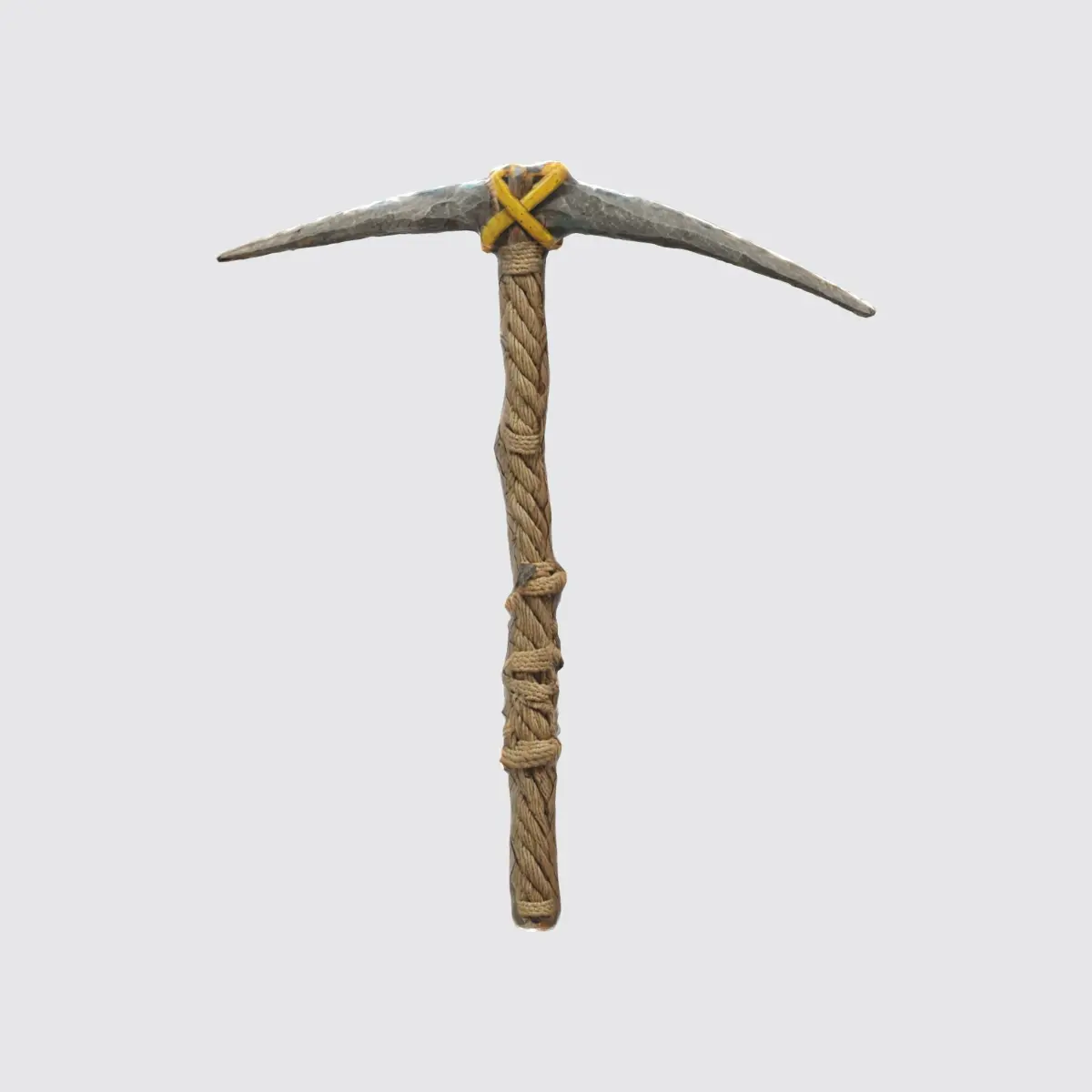 primitive pickaxe made with a horizontal sharp stone that is holding by some rope right on top of a long straight vertical wooden stick