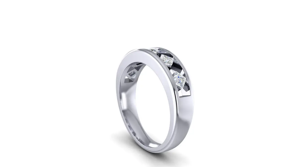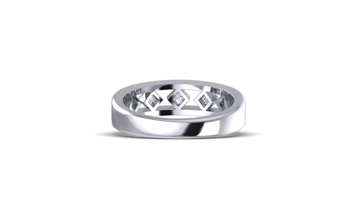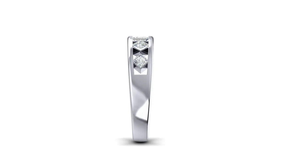 This striking unisex band showcases a modern geometric design with princess-cut diamonds set within a faceted white gold band. The bold, angular setting enhances the brilliance of each diamond, creating a sophisticated and contemporary look. Ideal for wedding bands or statement jewelry, this ring is perfect for those who appreciate unique craftsmanship and timeless elegance.
