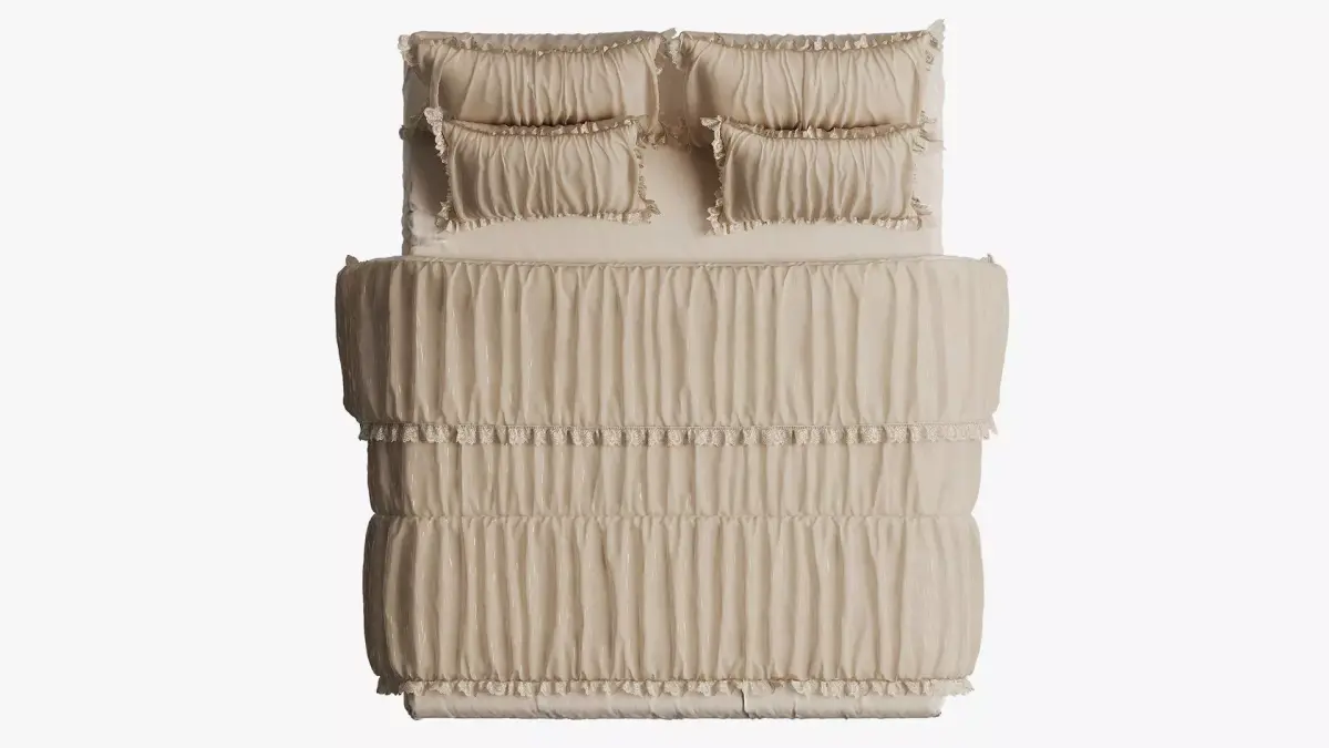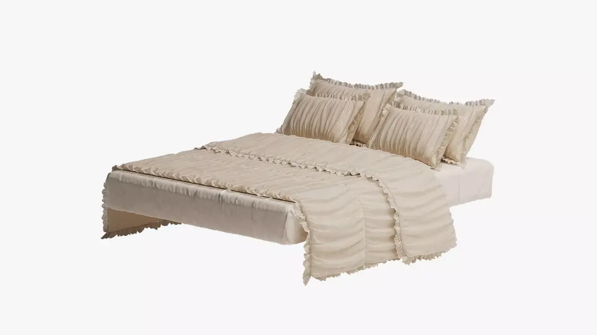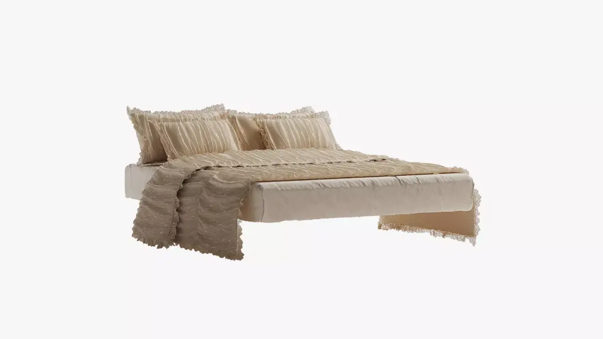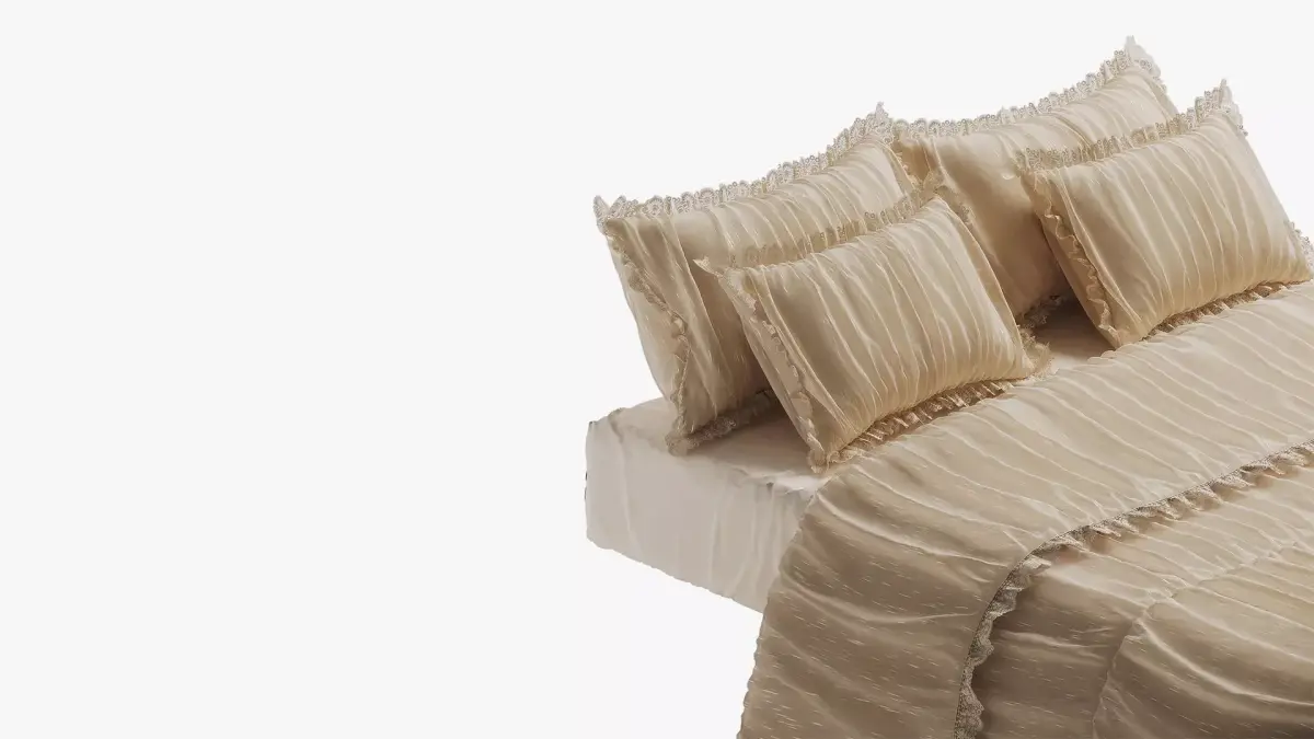 Bed linen with lace frills in a delicate beige color is suitable for a classic-style bedroom, for a teenage girl's bedroom, for a girl's nursery. Pillowcases and blankets are made of two types of fabric. There are an opaque dense basic and decorative translucent fabric with gold threads, creating a beautiful play of light and reflections. The numerous folds of the top layer also create a decorative effect.