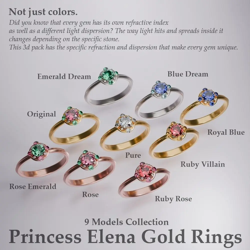 Highly detailed rings featuring unique designs and procedural textures, available in MTL format. For any issues or specific requests, please feel free to contact me. I'm working to offer various packs that include these rings and other color variations.These photorealistic assets are ideal for commercials and product placements. They are designed to work with realistic lighting and rendering but are not suited for real-time applications. The gem textures are compatible with Cycles in Blender.If you only need a single ring, don't worry! Contact me and we can make arrangements. The gems have accurate refraction and dispersion indices. Refer to the preview images for more information. The Blender file was created in version 4.1.
