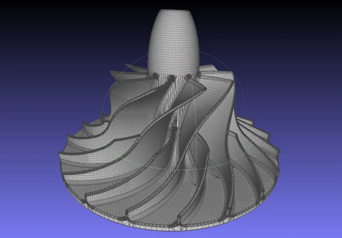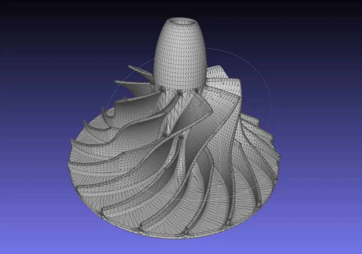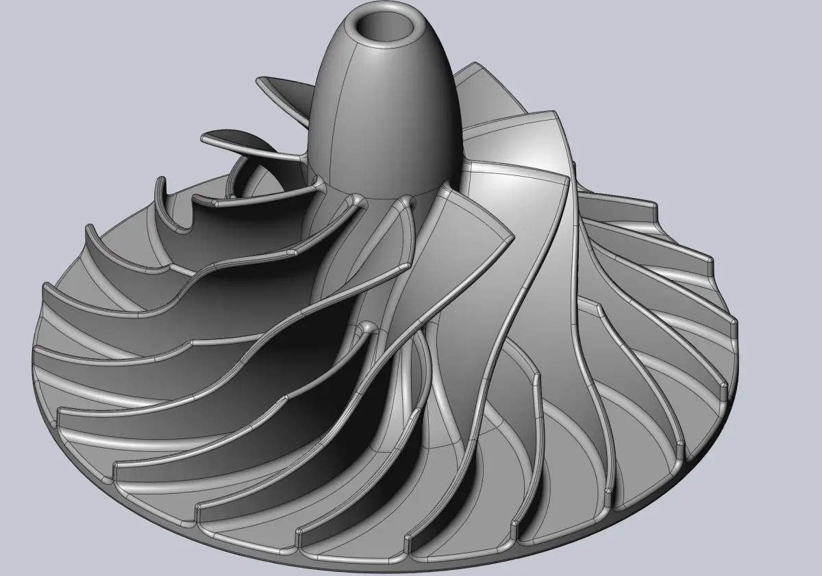 A model of a radial compressor impeller similar to those used in rocket engine turbopumpsthe model has a diameter of 200mm but can be scaled down and stays well printable down to below 50mmthis includes solid files like Parasolid as well as high poly STL and low poly mesh files which can leave visible polygon borders but are easier to handle for slicers