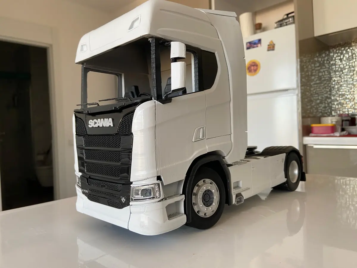 Scania S730All parts are in 3 different files.(Cabin, chassis, interior)Also available as a modeling file.The model kit is in 1/16 scale. You can change the scale if you want, but the most recommended scale is 1/16.For beautiful details you should print with 0.1-0.2mm