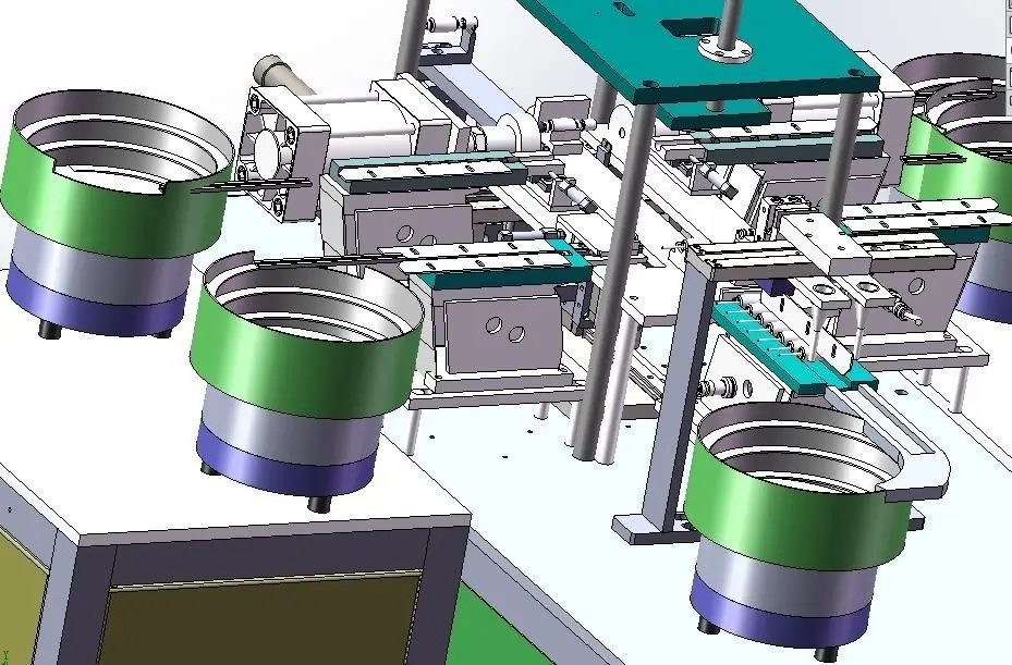Printer accessories bearing automatic assembly machine, SolidWorks original files, provided stp file, printer bearing assembly machine, five parts are all loose parts, which are directly vibrated and fed to the predetermined position by the vibration plate to complete the separation, pre-assembly and assembly actions.