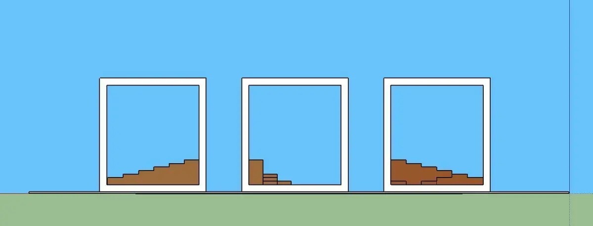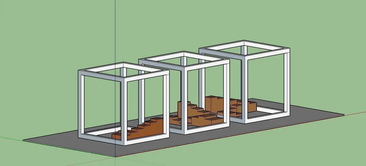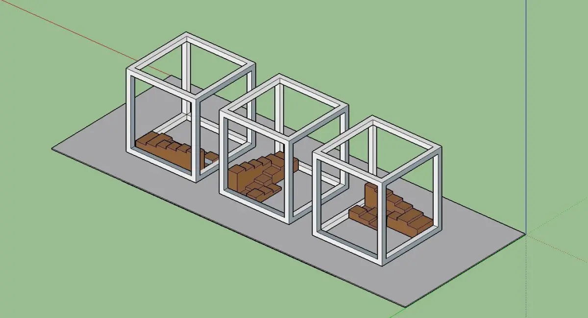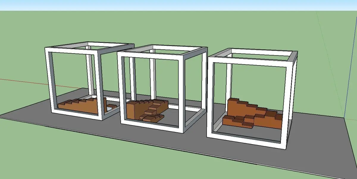Three prisms with dimensions 3.2mx3mx3m made as exterior installation with a little squares that have different height and can be used as a bench. Model is primary made for landscape design.