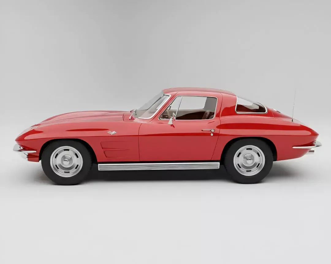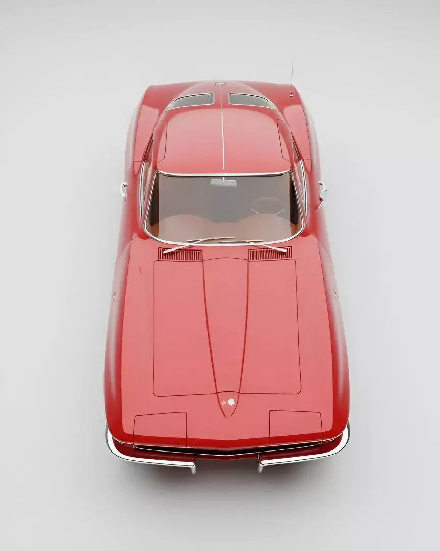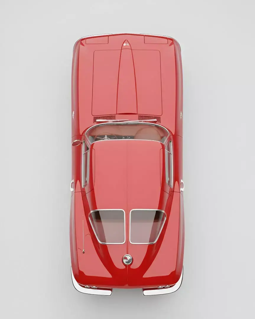 This image showcases a stunning red 1960s Chevrolet Corvette Stingray coupe, presented in pristine condition against a clean, light gray background. The classic American sports car features its iconic sleek lines, hidden headlights, and chrome bumper accents that define its era. The glossy red paint reflects the soft studio lighting, highlighting its curvaceous body. Period-correct silver wheels with black tires complete the authentic vintage look. This high-angle perspective emphasizes the car's beautiful proportions and timeless design, making it a true automotive icon.