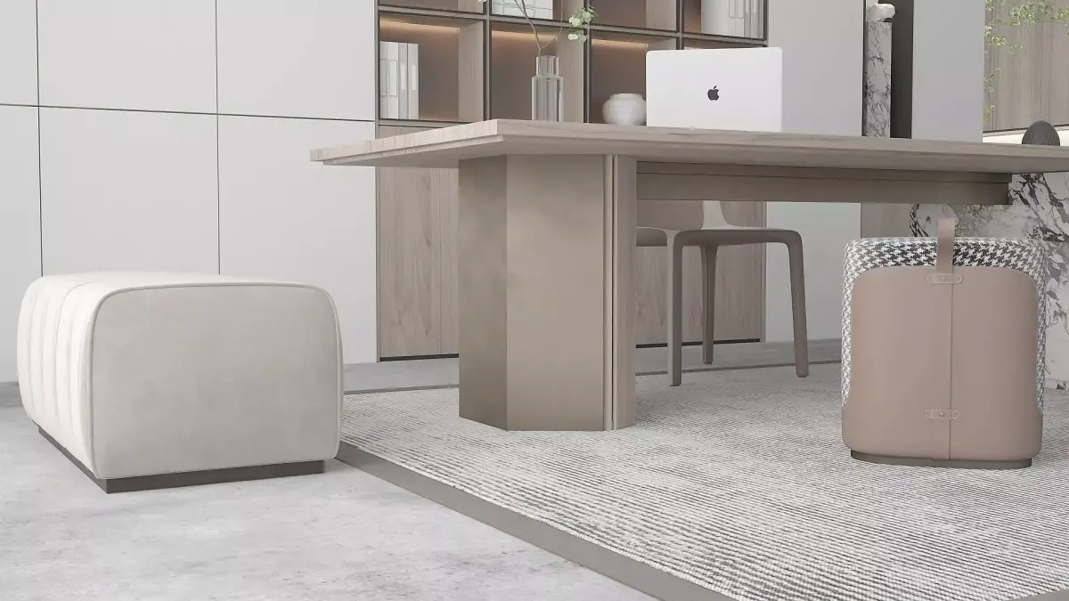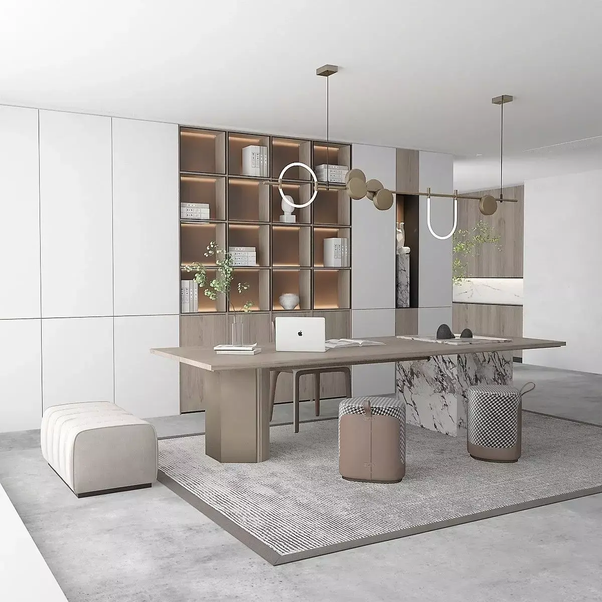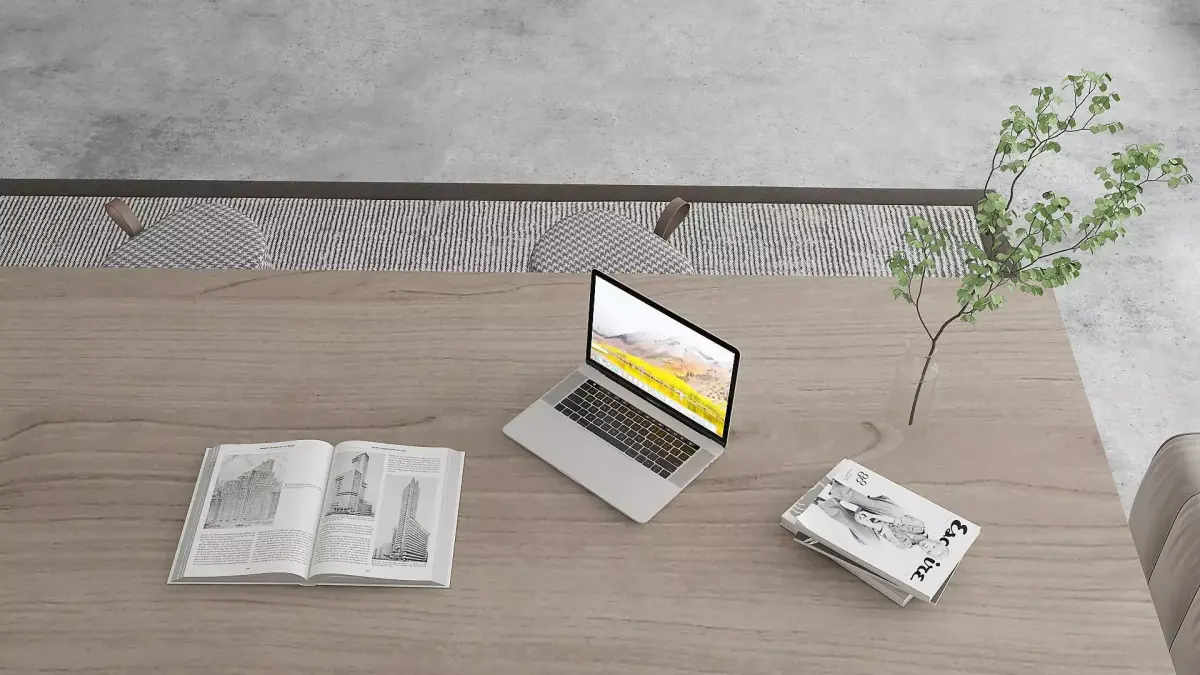 Private office design. Furniture set, MacBook Pro, various decorative items.