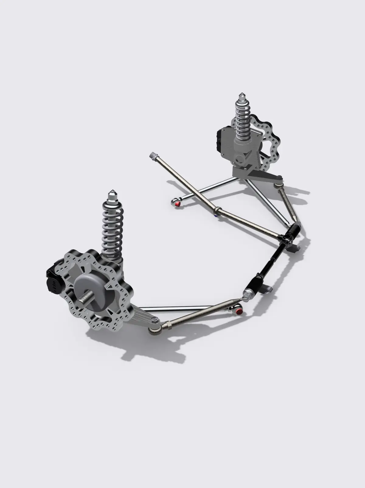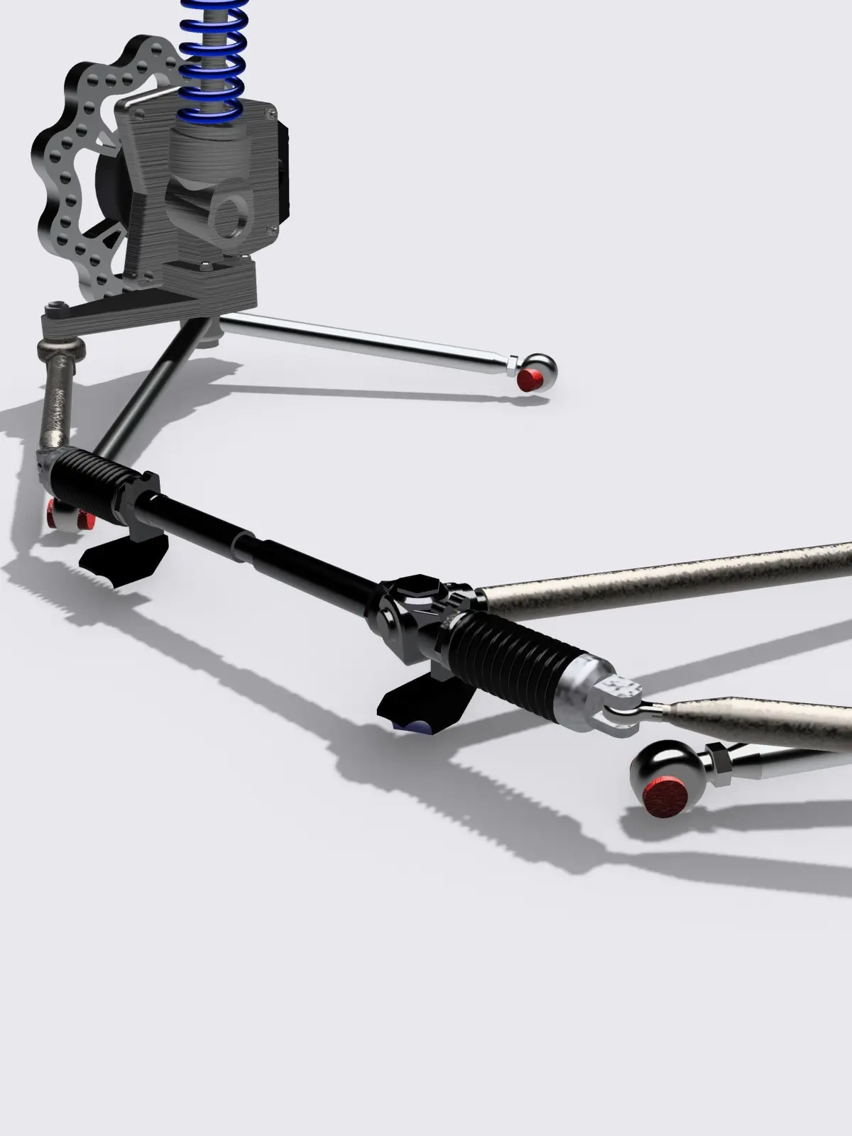 The assembly has 2 piece TBM brake discs & calipers, Strange style strut with coil, lower A-arms with integrated fittings & mounts, and steering rack - high in detail, ideal for scale modelling (currently in 1/24 and 1/25 scales).