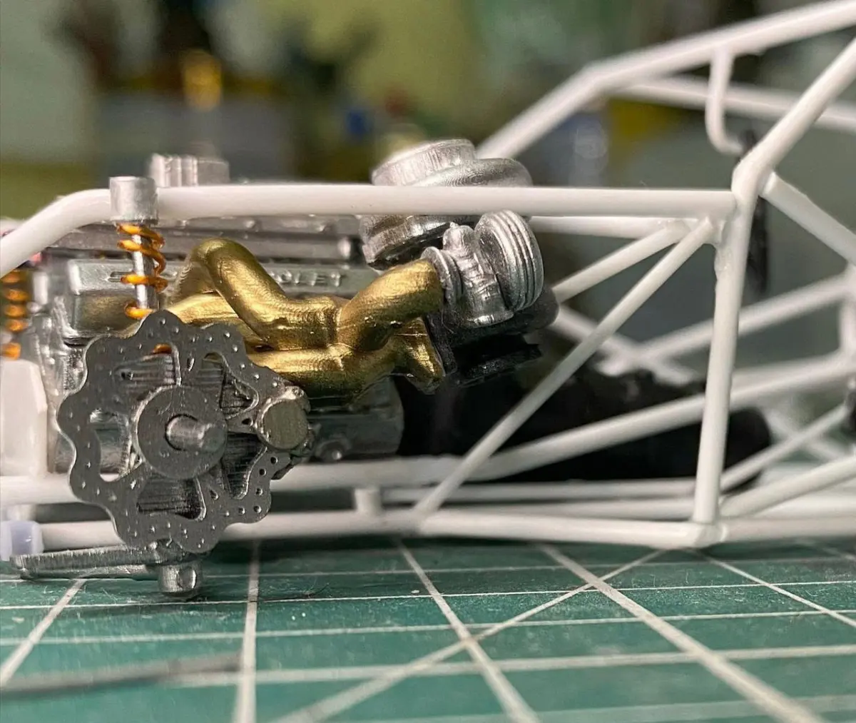 Designed from scratch is an equal length seat of headers for Twin Turbo V8 builds, ideal for scale modeling (currently in 1/24 and 1/25 scale). (Gold parts in photos)