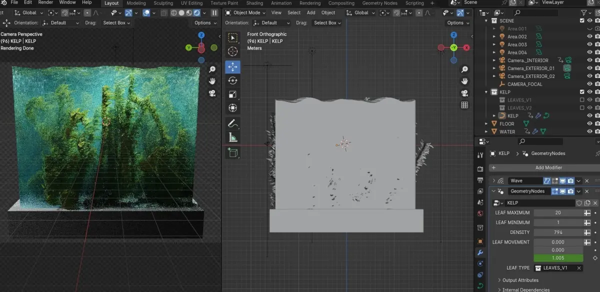 Animated kelp forest environment for underwater scenes. Simple Geometry Nodes interface is easy to customize. Kelp stems are animated with a wave modifier, leaves are animated directly with geometry nodes.