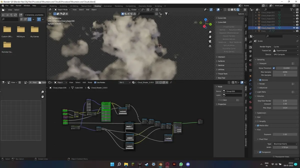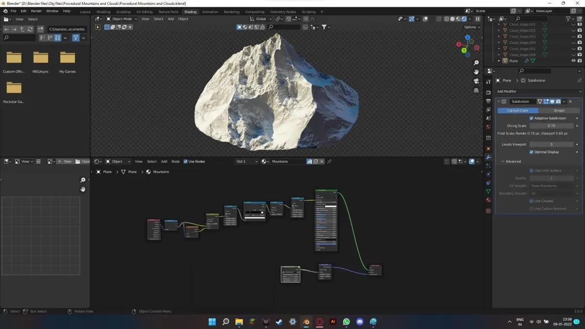 Here's a blend file for some procedural mountains that you can get infinite variations of!The snowy and rocky regions are procedurally shaded, based on the z normal value of each point.The blend file also has two procedural variations of volumetric cloud objects that can help you to add atmoshphere and mood to your scene! You can generate infinite variations of these clouds too. Math is fun!You can decrease the sample count to around 64 or even 32 along with the openImage denoiser included in Blender 3.0 for speedy render times!The included animation was rendered at 20 samples with denoiser and motion blur and minor compositing, which brought the render time down to 30 seconds per frame on my 1050ti mobile.