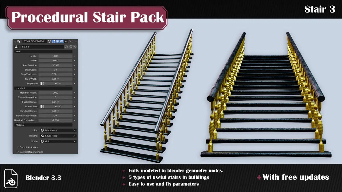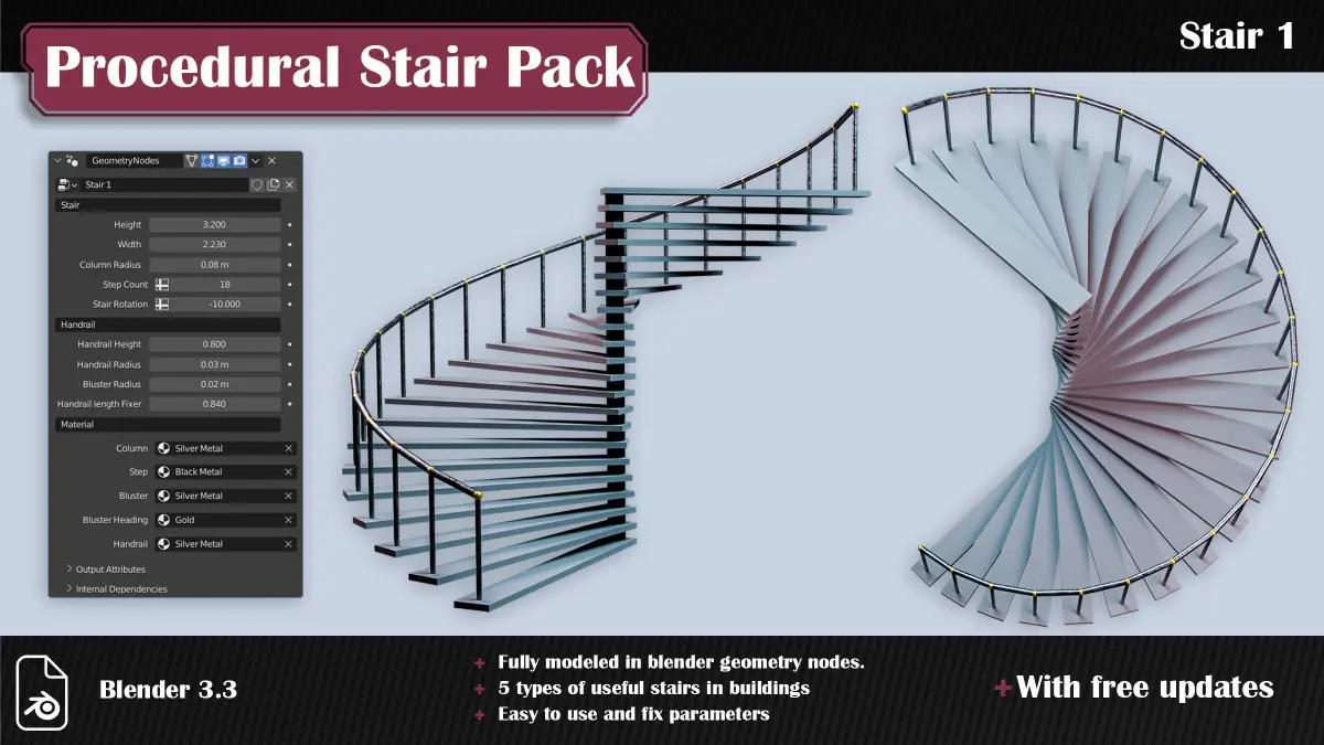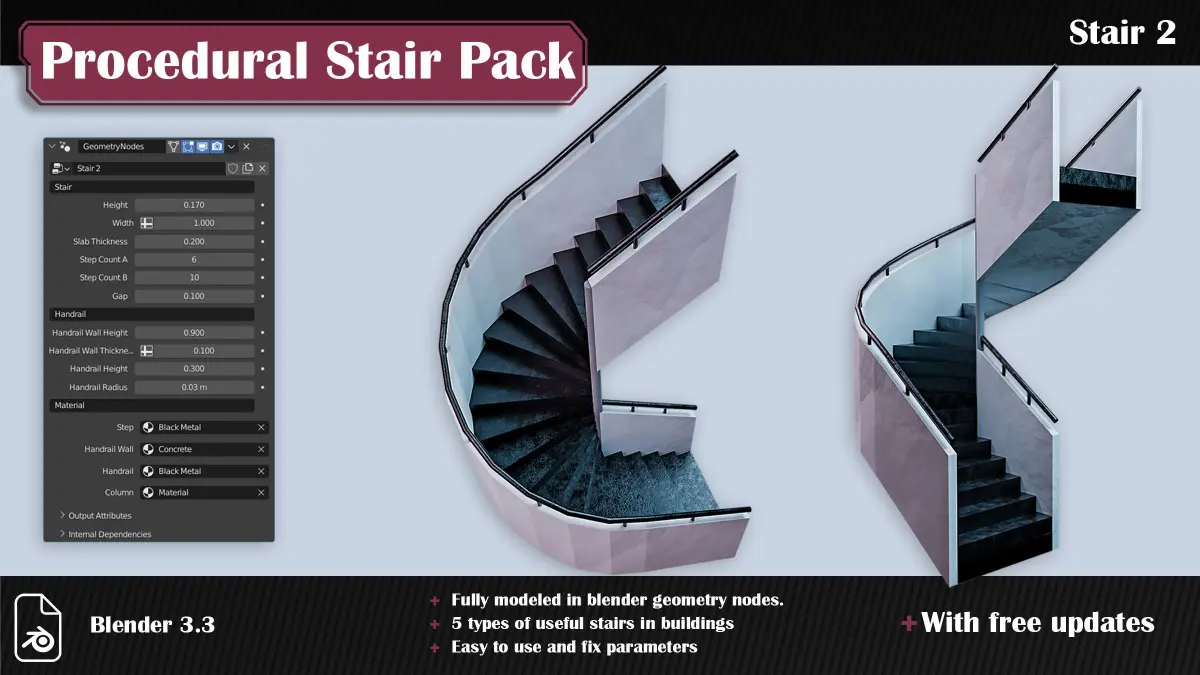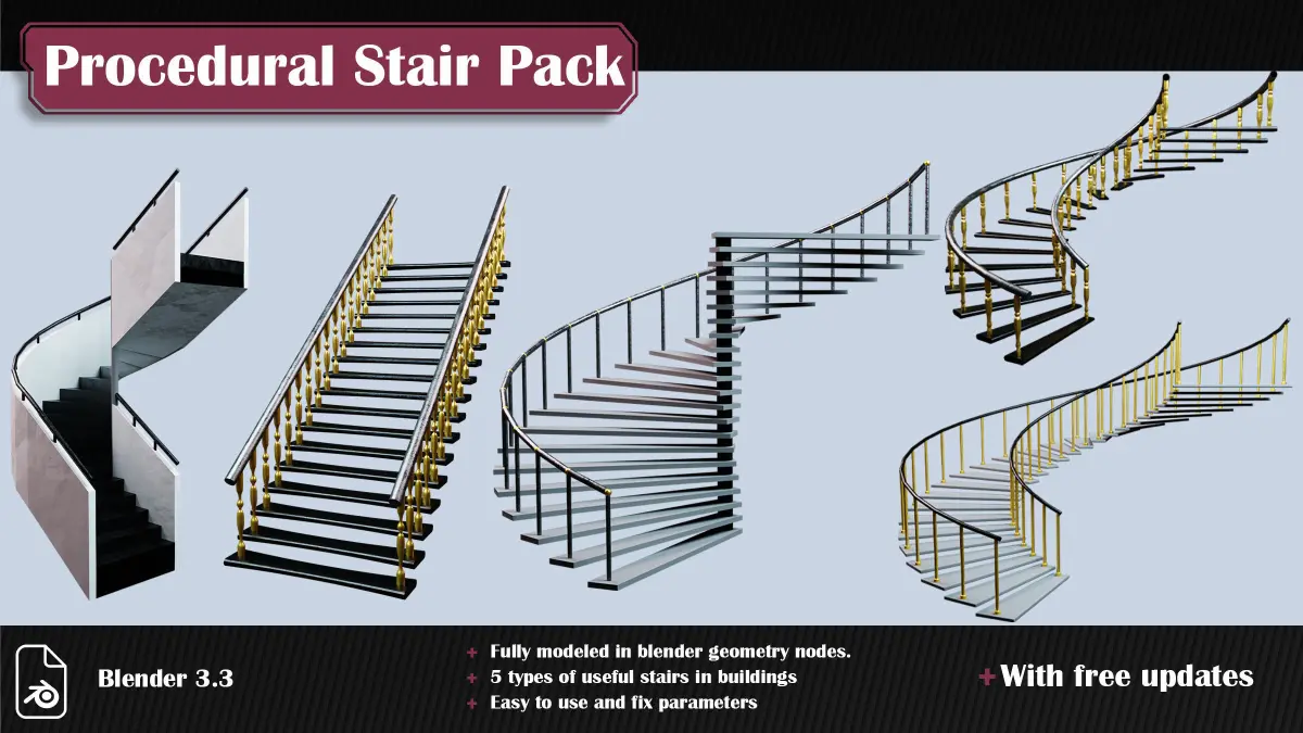 The pack contains five geometry node generators with five presets, and you can create stairs with different dimensions. More generators will be added hopefully in the future with free updates.