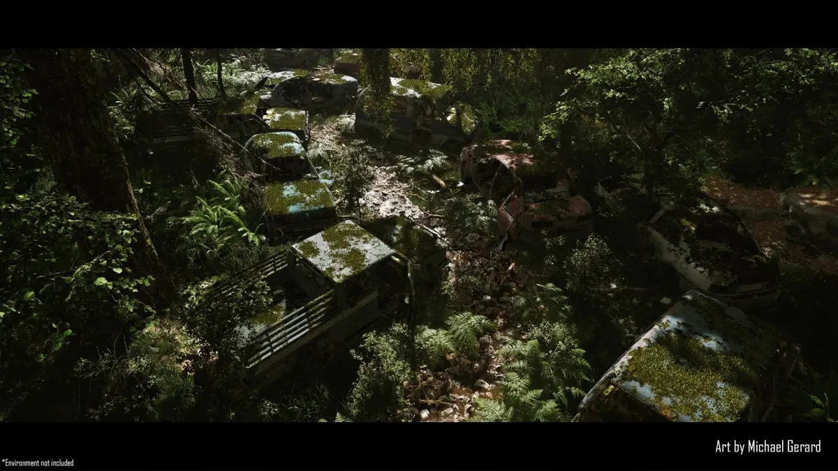 - Foliage and Moss Simulations - Simulations have been run in third-party software and imported into Unreal for realistic coverage. (22 unique foliage meshes and 20 shared foliage meshes per vehicle)
