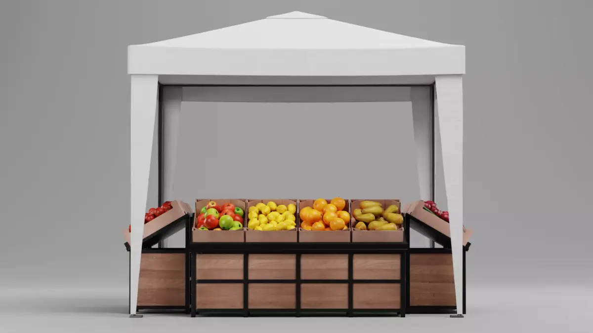 A complete 3D market stall featuring a fabric canopy, wooden display racks and a selection of assorted produce stored in cardboard boxes. The fruits and vegetables follow realistic proportions with natural surface variation, supported by detailed materials that capture typical color and texture differences. The overall setup forms a cohesive, ready-to-use asset suitable for scenes requiring everyday market visuals.