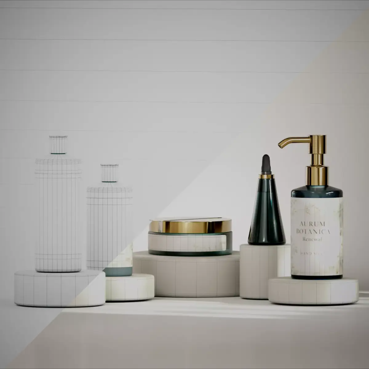 It also includes surface imperfect materials, setup with correect IOR, spec etc - Metal, Glass and some simple plastics
