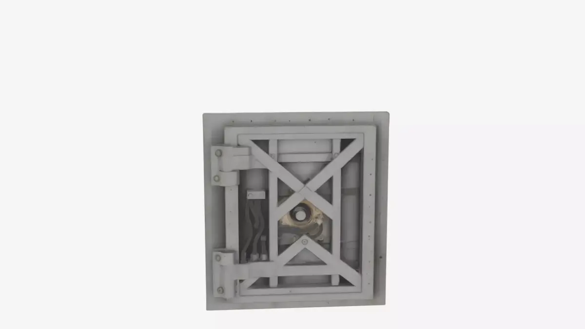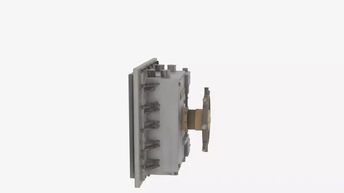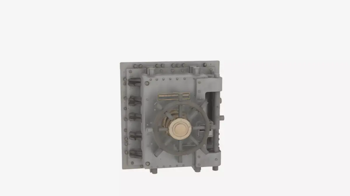 An impressive heavy-duty bank vault door featuring a robust circular locking wheel with multiple intricate bolt mechanisms and a sophisticated time-delay lock system. Constructed with reinforced steel for maximum security, this model showcases detailed metal textures, precision engineering, and comprehensive bolt threading. The four-view presentation displays the front with manufacturer markings, back with hinge plates and door thickness, left side showing bolt extension depth and frame integration, and right side detailing the wheel spokes and lock housing.