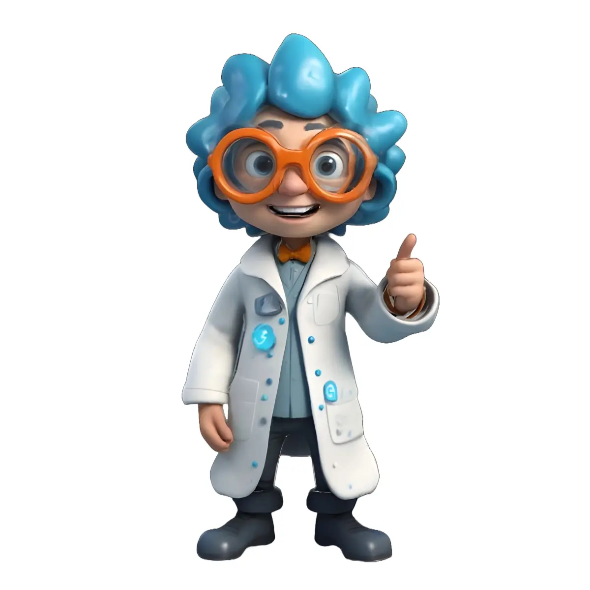 - A fun kid scientist/researcher with wild blue hair and orange goggles